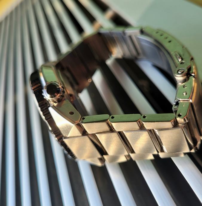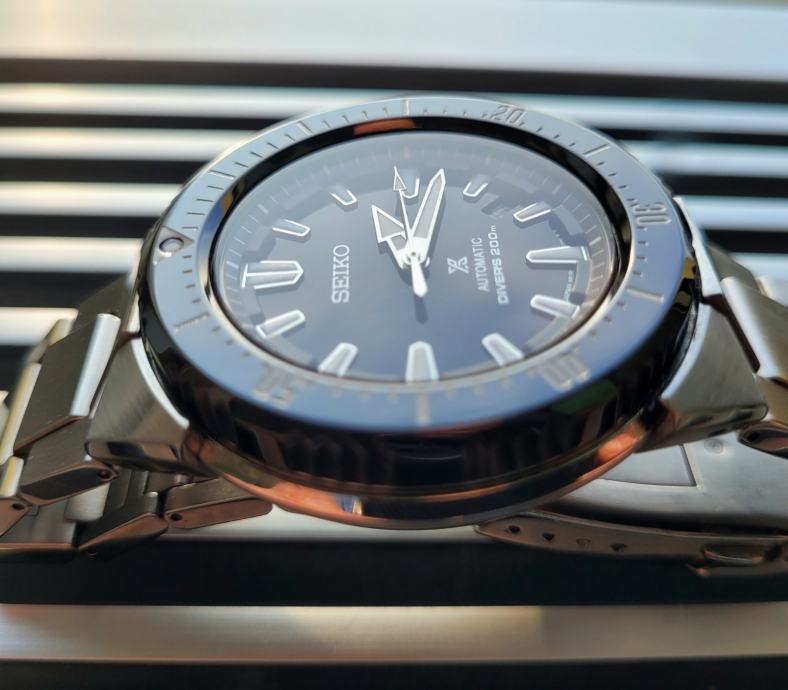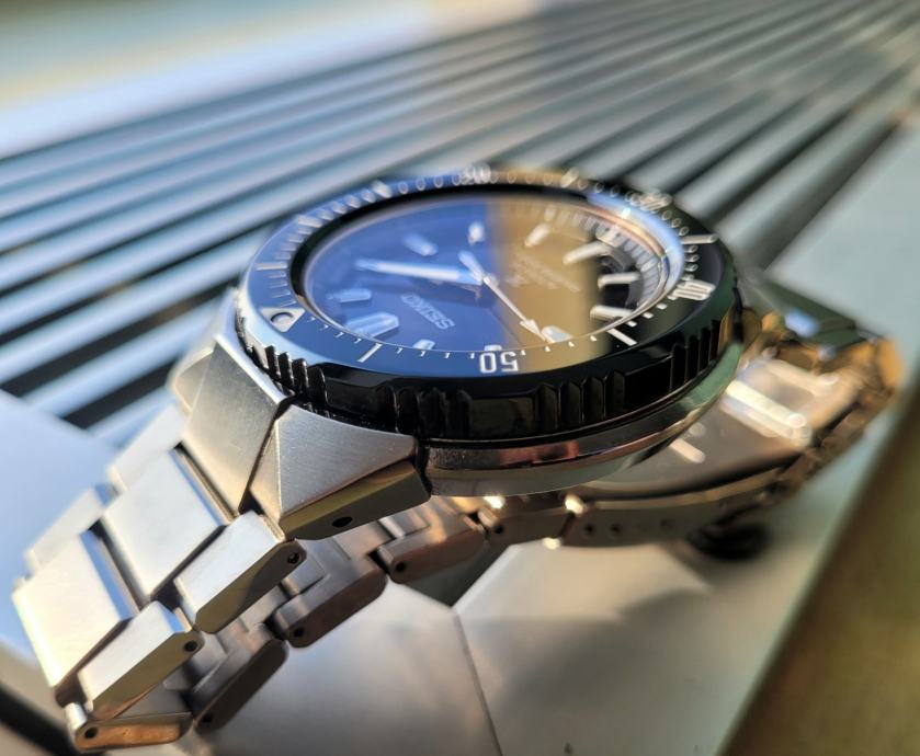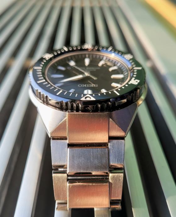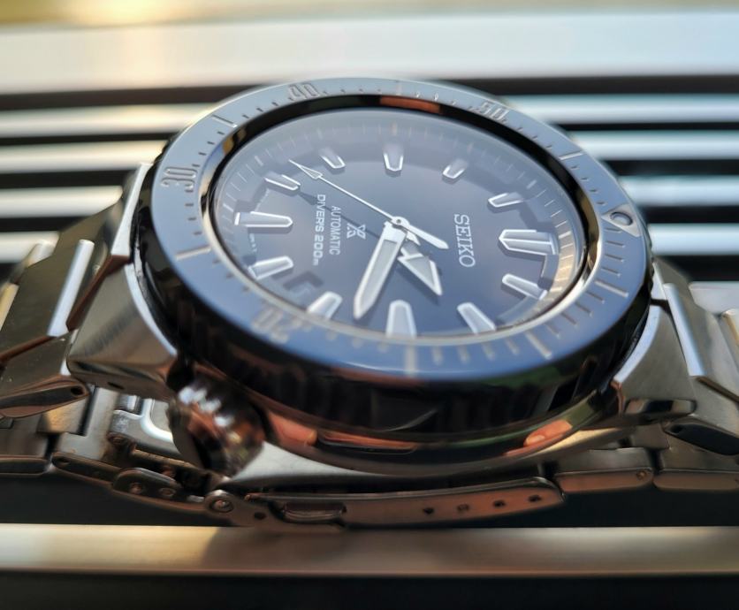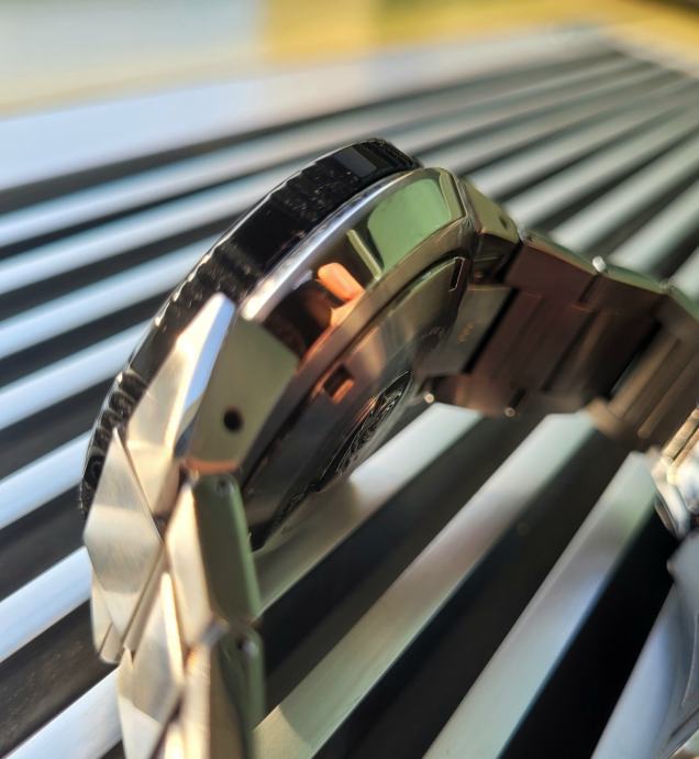 Safirno staklo, keramički bezel (cijeli, ne samo insert) - laserski izrezbarene brojke i markeri na istom, bezel fiksiran sa dva vijka na 6 i 12 (kao kod Sinn divera), keramički umetak na krunici, diashield obrada kućišta i narukvice, integrirana narukvica koju satu odgovara fantastično.