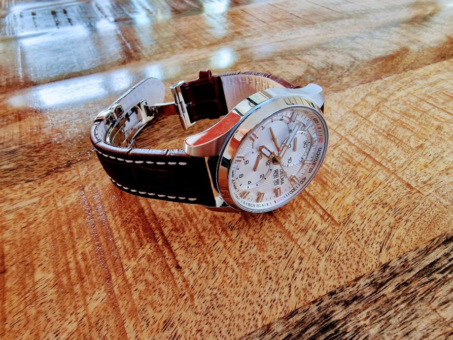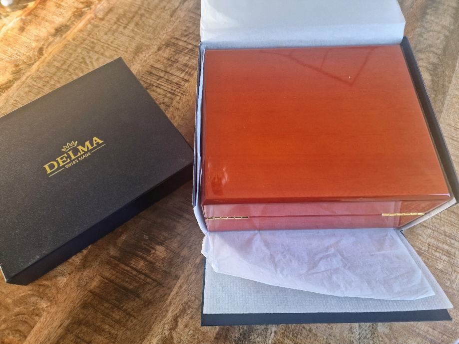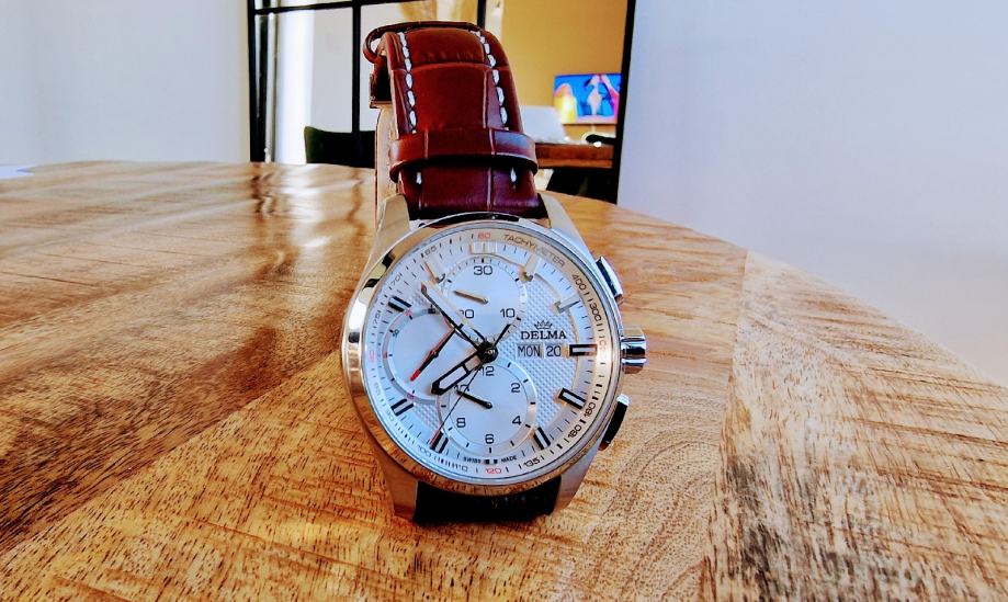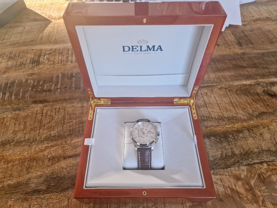 Prodajem automatski sat renomirane švicarske tvrtke DELMA. Sat Delma Klondike Chronotec je potpuno nov i nekorišten. Dolazi sa original smeđom kožnom narukvicom u originalnom pakiranju. Cijena je 2500 EUR. U obzir dolaze razne vrste zamjena.