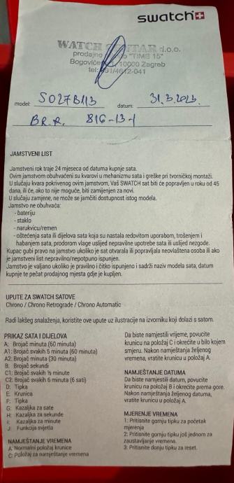 Prodajem ručni sat marke Swatch otporan na vodu u originalnom pakiranju. Sat je jednom samo isproban, nije korišten.