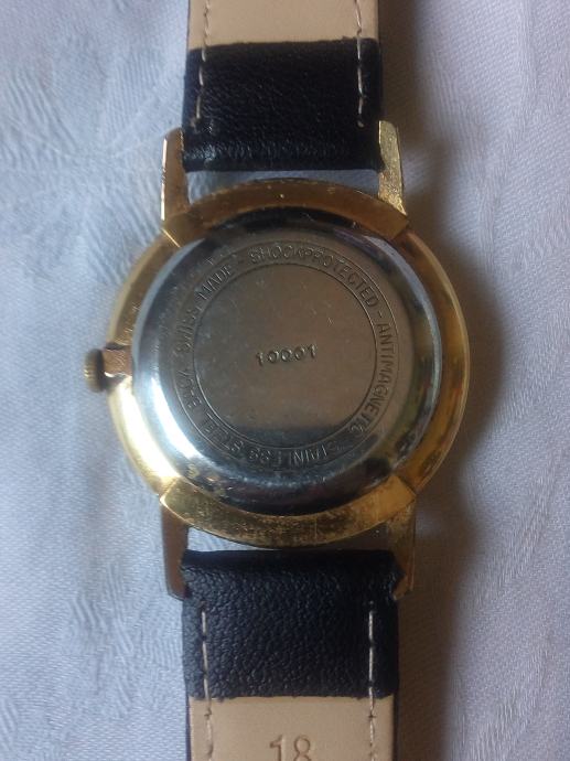Rezervirano Janja, SLO. Švicarski sat na navijanje pozlaćen, sa 17 rubina, servisiran, ispravan, novi kožni remen, promjera 34 mm. Dostava po dogovoru, o Vašem trošku. Whatsup za dodatne slike i daljnju komunikaciju. Molim samo ozbiljni upiti. Molim da mi dopustite par dana za odgovor. Sesvetski Kraljevec.