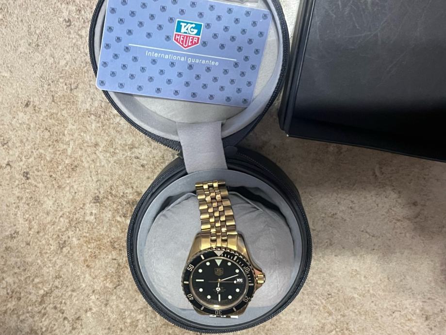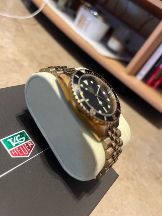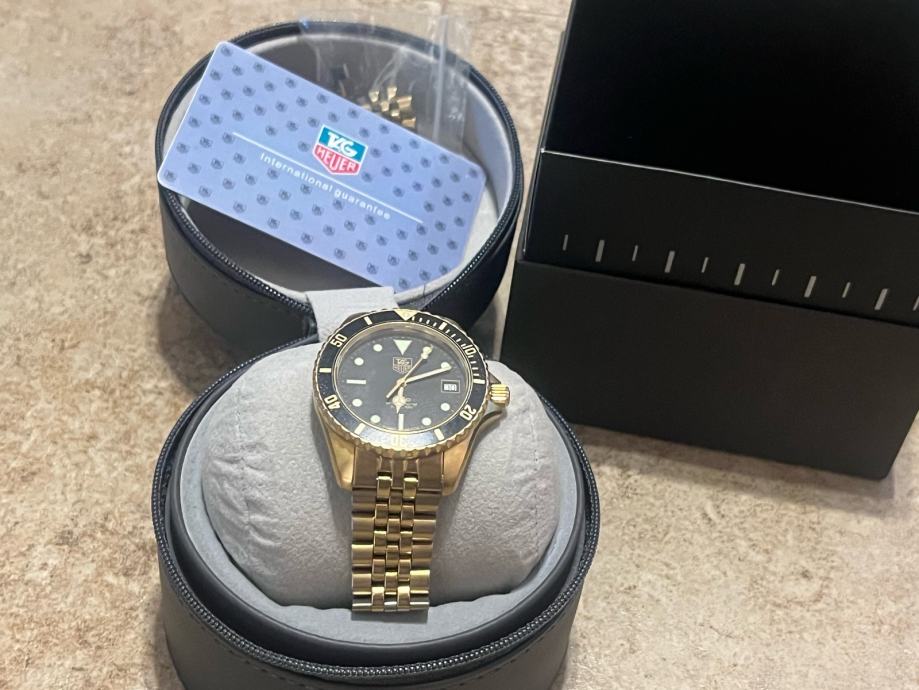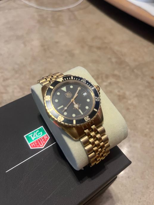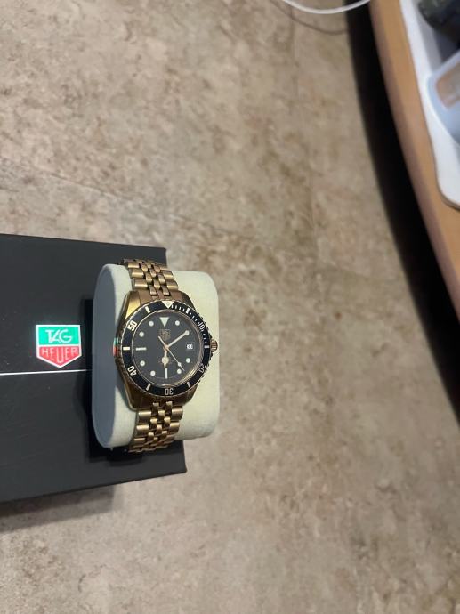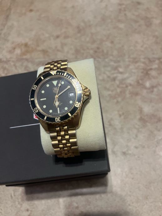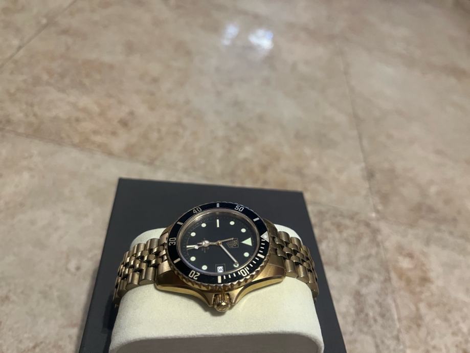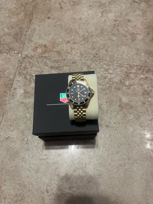 Vintage TAG Heuer 1000 Professional Driver Wolf of Wall Street 24K pozlaćeni 984.013B švicarski kvarcni sat prekrasan je sat koji odiše stilom i luksuzom. Sat ima kućište i narukvicu od nehrđajućeg čelika koji su dizajnirani da traju, bez ogrebotina na staklu i samo s manjim ogrebotinama na kućištu, stražnjoj strani, okviru i narukvici. Sat ima okrugli pokretni okvir i staklo od safirnog kristala. Sat ima širinu kućišta od 41 mm, uključujući krunu, veličina remena sata je 210 mm i može udobno stati na ručni zglob od 8 inča sa širinom ušice od 20 mm. Ima prozor s datumom koji se nalazi na poziciji 3 sata, što olakšava praćenje datuma. Švicarski kvarcni mehanizam sata osigurava točno mjerenje vremena. Sve u svemu, ovaj sat je u vrlo dobrom stanju, čak je i kopča u izvrsnom stanju i drži sat sigurno pričvršćenim. Dizajn i značajke sata čine ga idealnim izborom za svečane i ležerne prilike, a sigurno će zapeti za oko svima koji cijene fine satove. Ako tražite visokokvalitetni sat koji je istovremeno moderan i funkcionalan, TAG Heuer 1000 Professional Driver Wolf of Wall Street 984.013B Swiss Quartz