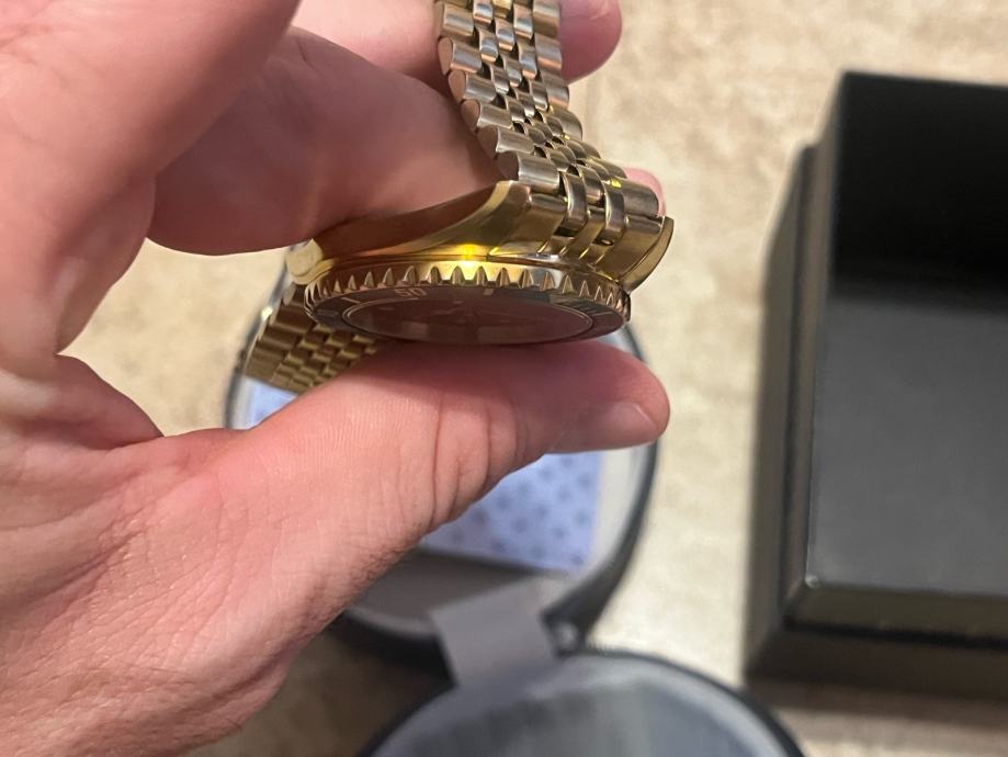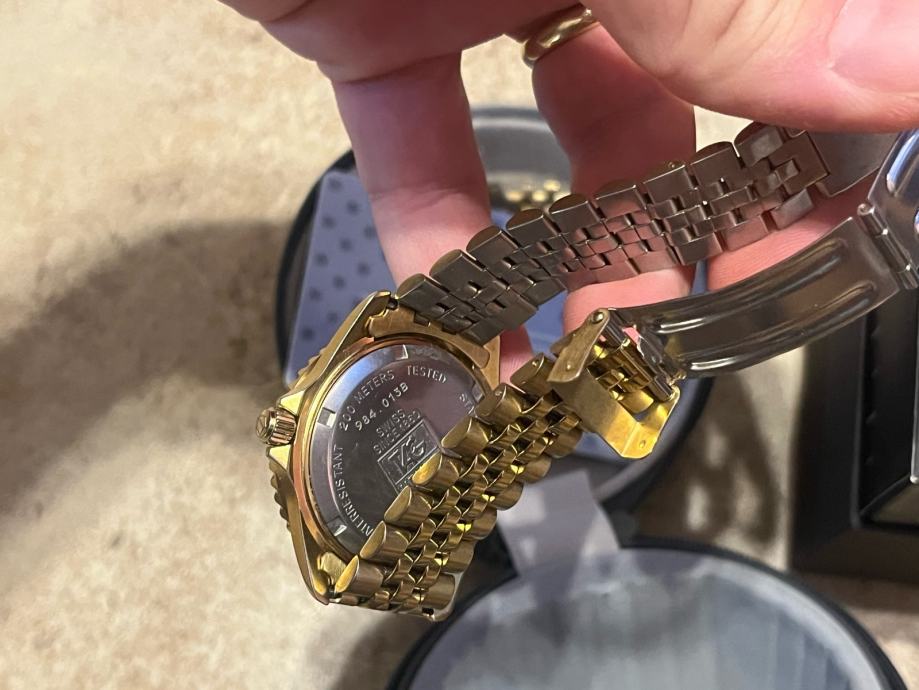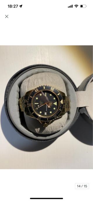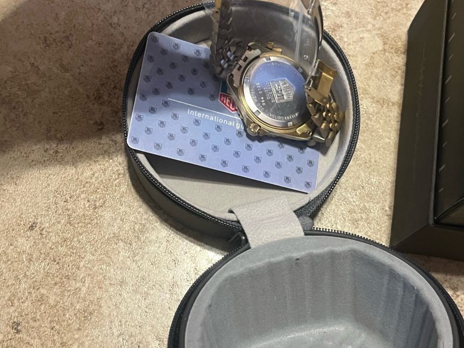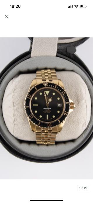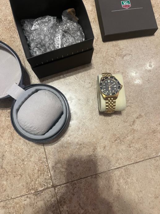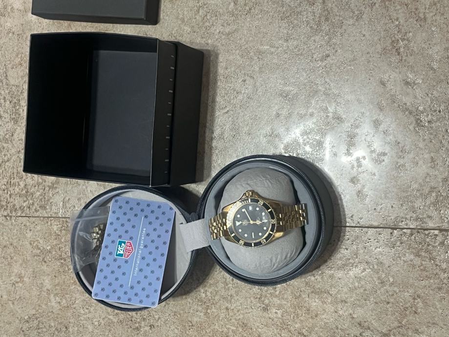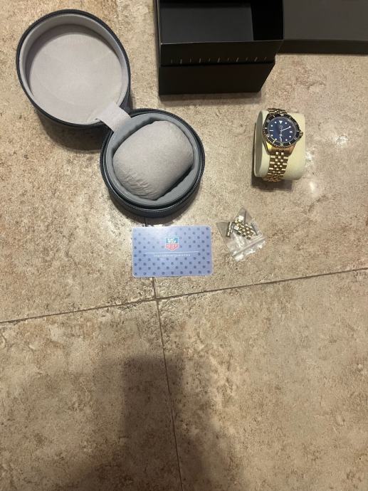 Vintage TAG Heuer 1000 Professional Driver Wolf of Wall Street 24K pozlaćeni 984.013B švicarski kvarcni sat prekrasan je sat koji odiše stilom i luksuzom. Sat ima kućište i narukvicu od nehrđajućeg čelika koji su dizajnirani da traju, bez ogrebotina na staklu i samo s manjim ogrebotinama na kućištu, stražnjoj strani, okviru i narukvici. Sat ima okrugli pokretni okvir i staklo od safirnog kristala. Sat ima širinu kućišta od 41 mm, uključujući krunu, veličina remena sata je 210 mm i može udobno stati na ručni zglob od 8 inča sa širinom ušice od 20 mm. Ima prozor s datumom koji se nalazi na poziciji 3 sata, što olakšava praćenje datuma. Švicarski kvarcni mehanizam sata osigurava točno mjerenje vremena. Sve u svemu, ovaj sat je u vrlo dobrom stanju, čak je i kopča u izvrsnom stanju i drži sat sigurno pričvršćenim. Dizajn i značajke sata čine ga idealnim izborom za svečane i ležerne prilike, a sigurno će zapeti za oko svima koji cijene fine satove. Ako tražite visokokvalitetni sat koji je istovremeno moderan i funkcionalan, TAG Heuer 1000 Professional Driver Wolf of Wall Street 984.013B Swiss Quartz