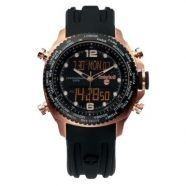 A stylish mens watch with digital/analogue display, with world time feature, Black bezel engraved with various cities, 5ATM, with stainless steel case