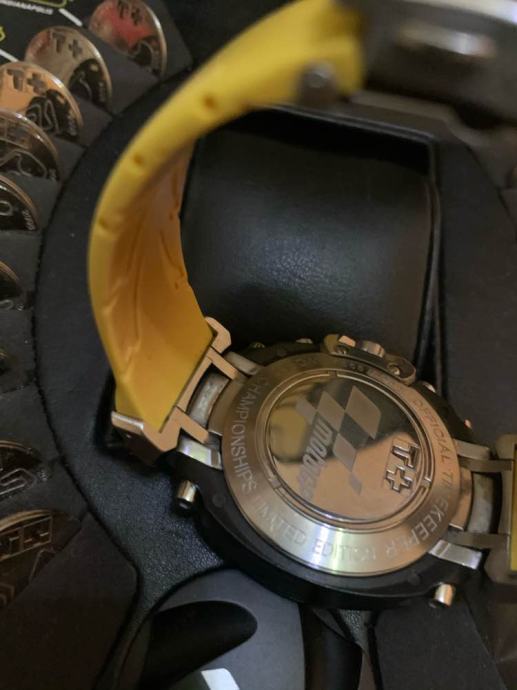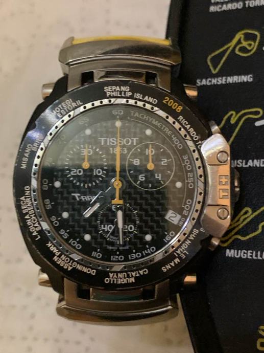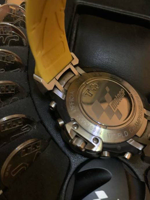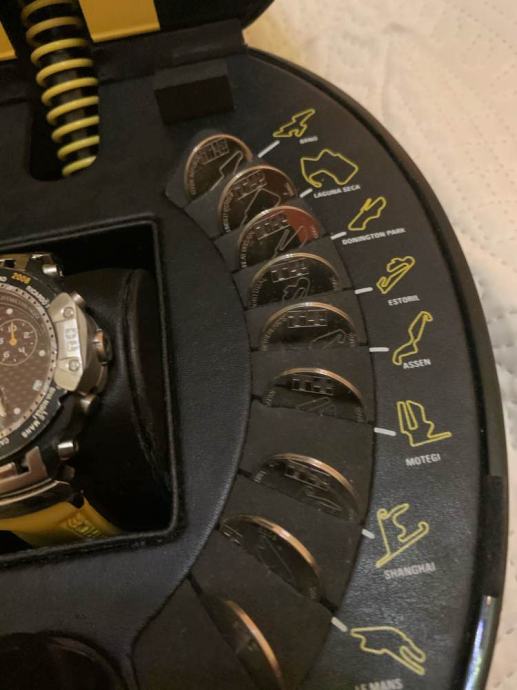 Stainless steel and carbon fibre Stylised rotating bezel, with the 18 world championship MotoGP 2008 circuits Scratch-resistant sapphire crystal Interchangeable engraved back Water-resistant to 100 m Limited edition of 8002 individually-numbered pieces