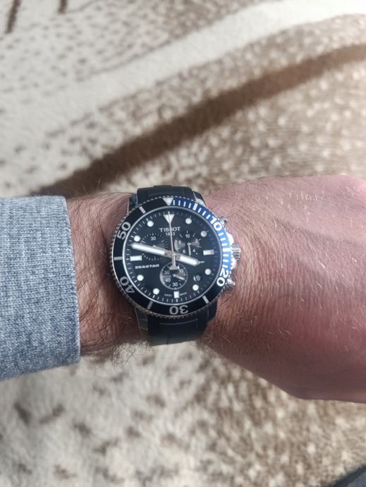 Prodajem Tissot seastar 1000 cronograf , quartzni sat u odlicnome stanju kupljen 02.11.2023 g . U trgovini satova Krona. Sat je slabo nosen zbog toga jer imam vise satova, nema niti jednu ogrebotinu , posjeduje uz gumenu narukvicu jos jednu tekstilno - gumenu narukvicu sa pripadajućom kutijom i ostalim papirima.