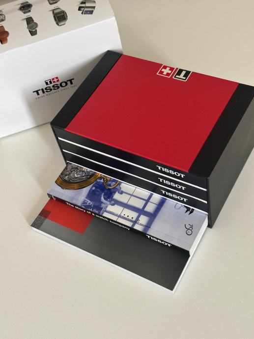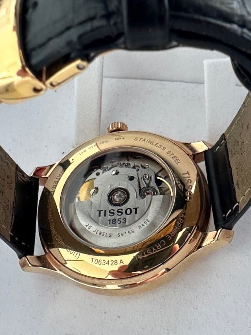 Kućište je u zlatnoj boji od nehrđajućeg čelika, s elegantnim bijelim brojčanikom ukrašenim guilloche uzorkom, rimskim brojkama i malim sekundnim brojčanikom na 6 sati. Remen je crni, od kože s krokodilovim uzorkom. Sat dolazi s originalnom Tissot kutijom.