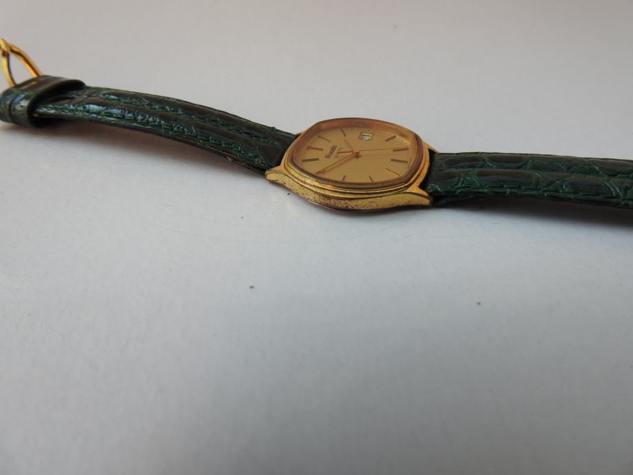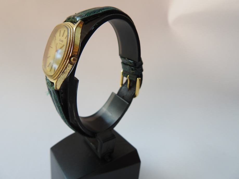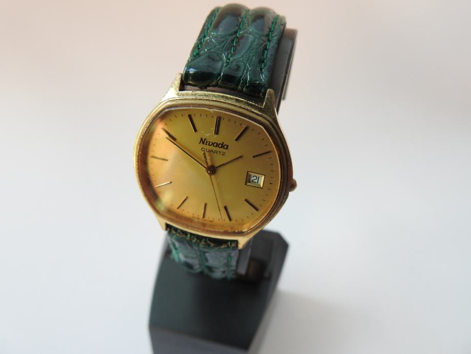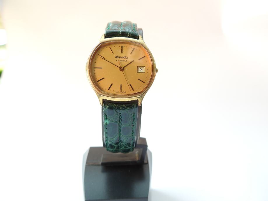 Klasični dizajn s pozlaćenim kućištem i zelenim kožnim remenom s uzorkom krokodilske kože.