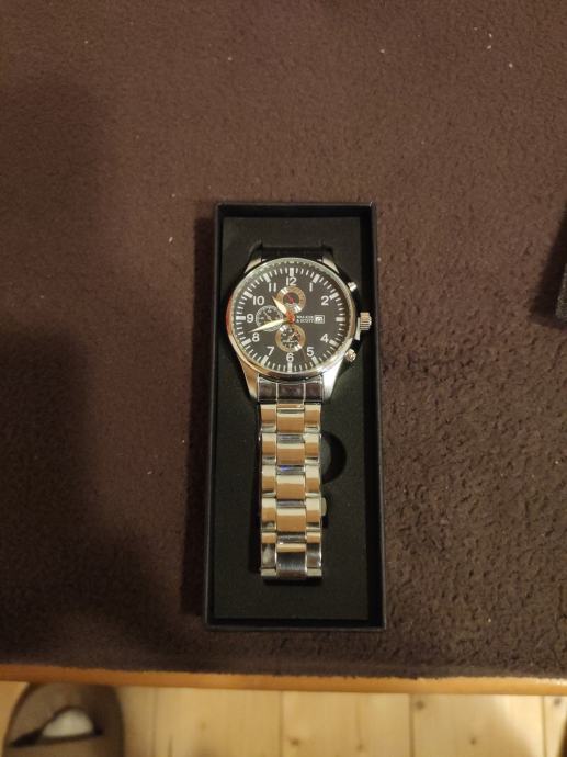 Prodajem muški ručni sat marke Walker & Scott. Radi se o satu s kronografskim dizajnom, tamnim brojčanikom i metalnom narukvicom srebrne boje. Sat je nov