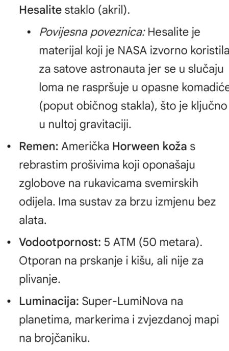 Materijali: Kućište od nehrđajućeg čelika, Hesalite kristal (sličan onom na originalnim satovima astronauta) i remen od poznate Horween kože (što se vidi na poleđini).