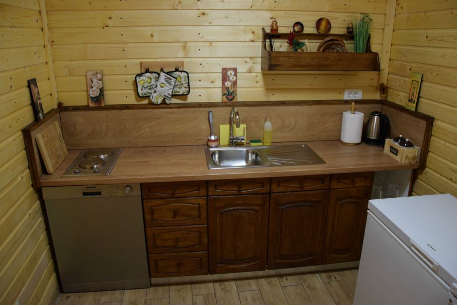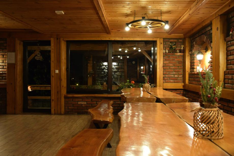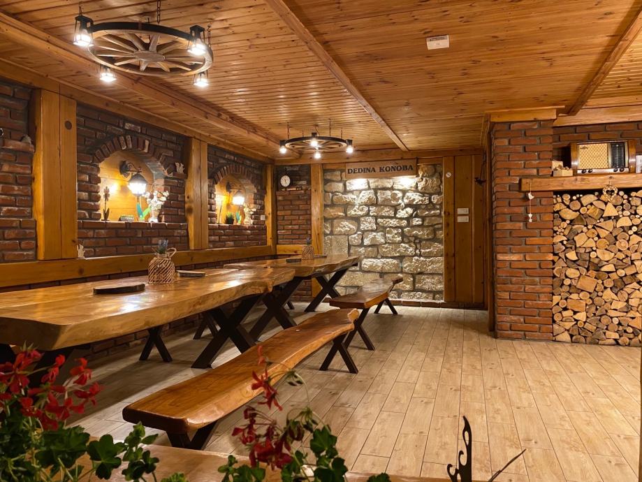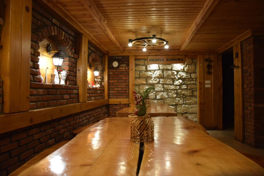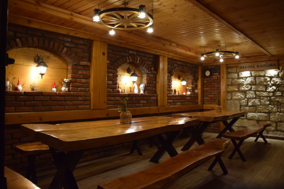 Dedina konoba može zaprimiti do 40 osoba. U velikoj prostoriji se nalaze dva masivna stola (dimenzija 2,5 x 1 m), koji imaju kapacitet sjedećih mjesta za do 24 osobe. Po potrebi možemo osigurati još jedan ili dva dodatna stola sa klupama, koji zajedno imaju kapacitet sjedećih mjesta za do 16 osoba.