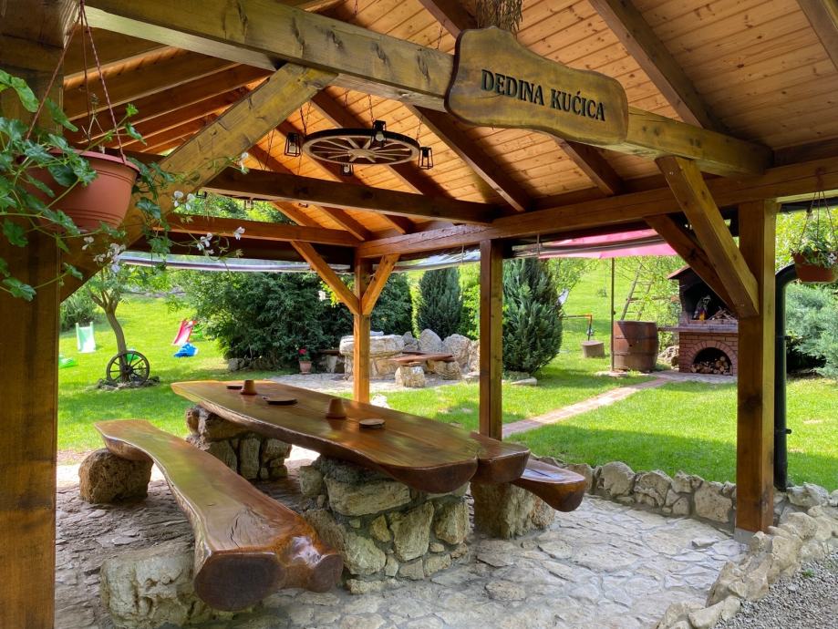 U sklopu vanjskog dijela (dvorišta), Dedina kućica može zaprimiti do 30 osoba. Tamo se nalazi masivni stol (dimenzija cca 4 x 1 m), koji ima kapacitet sjedećih mjesta za do 20 osoba. Po potrebi možemo osigurati još i dodatni stol sa klupama, koji ima kapacitet sjedećih mjesta za do 10 osoba. Ova varijanta sa dvorištem je idealna za sve koji planiraju boravak na otvorenom po lijepom vremenu.