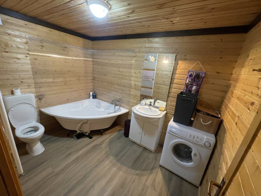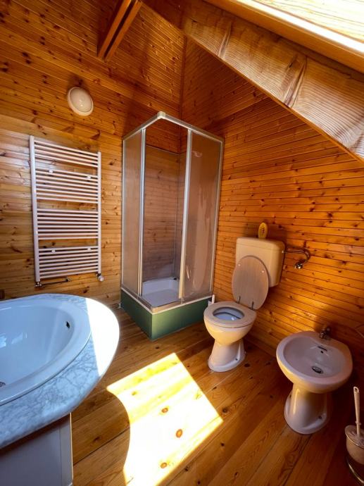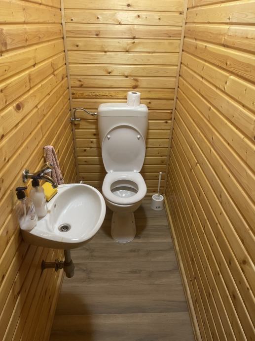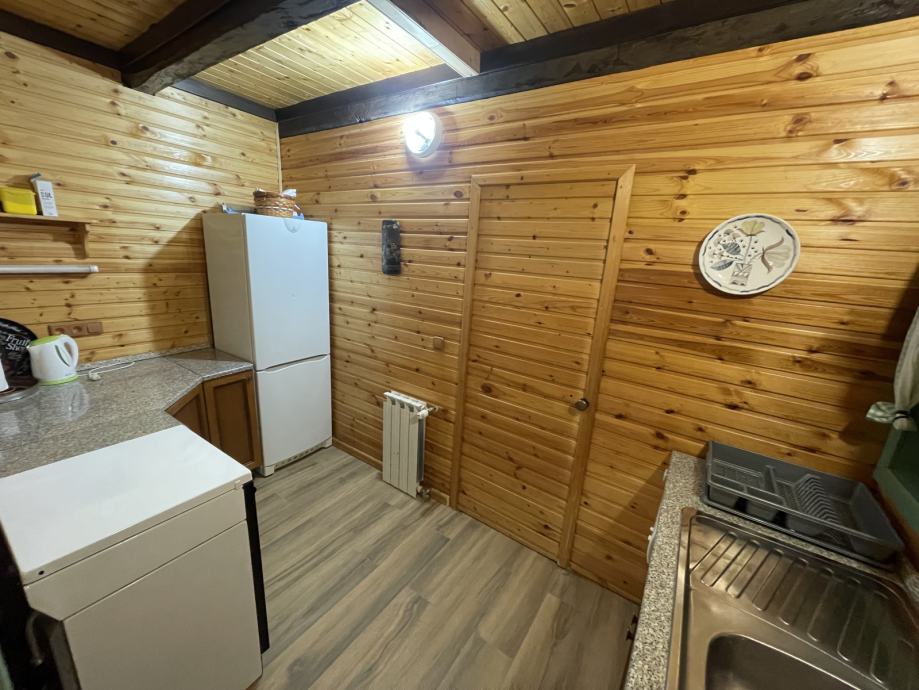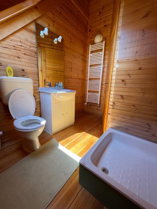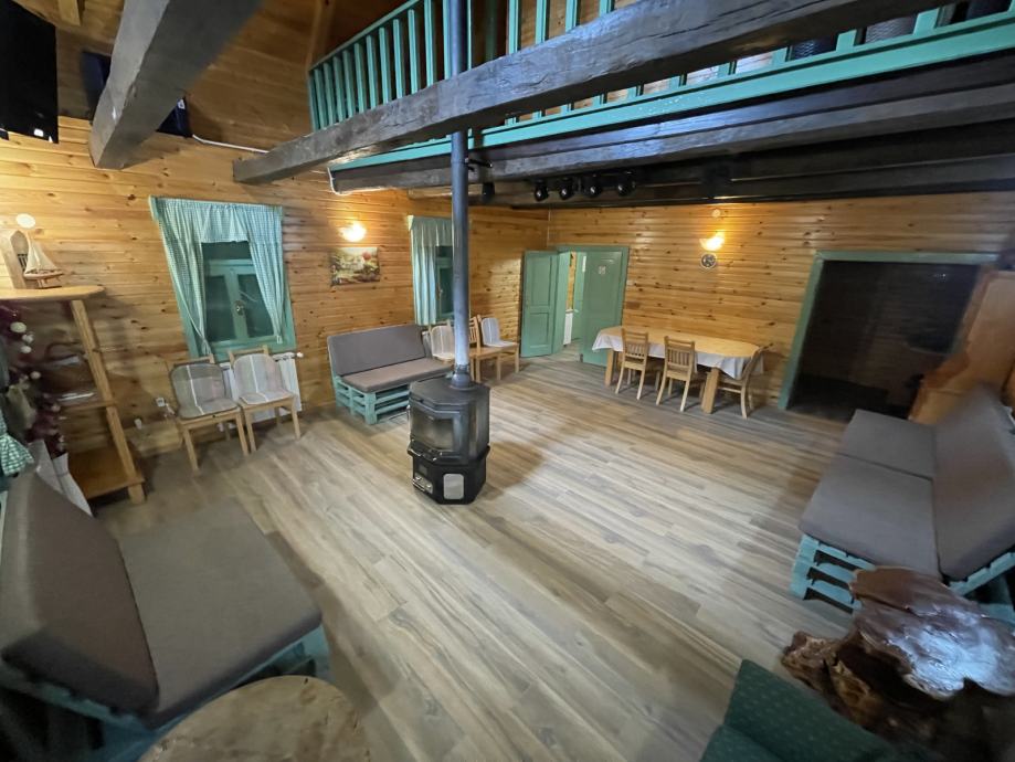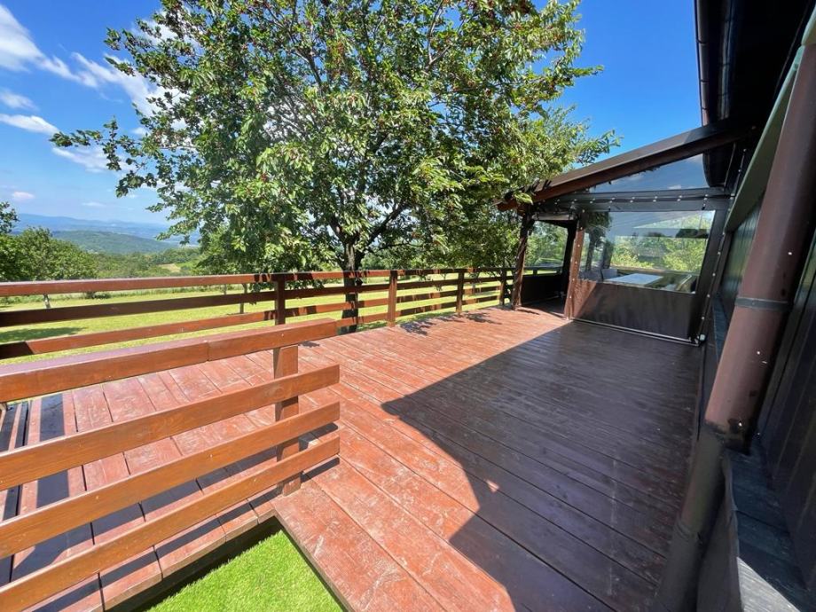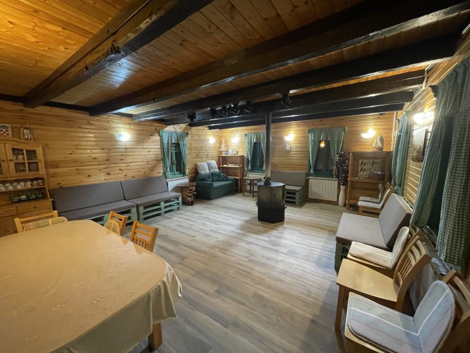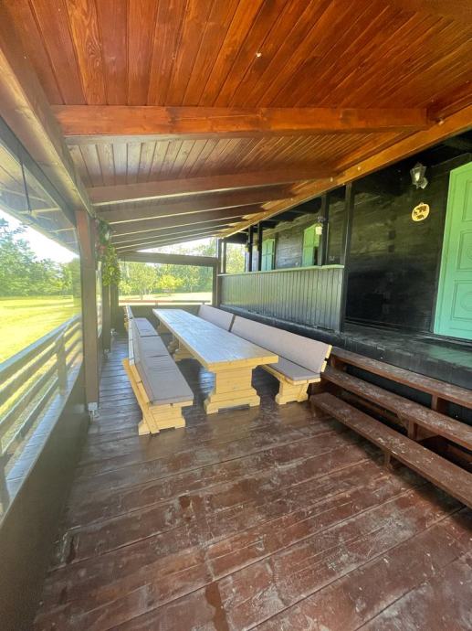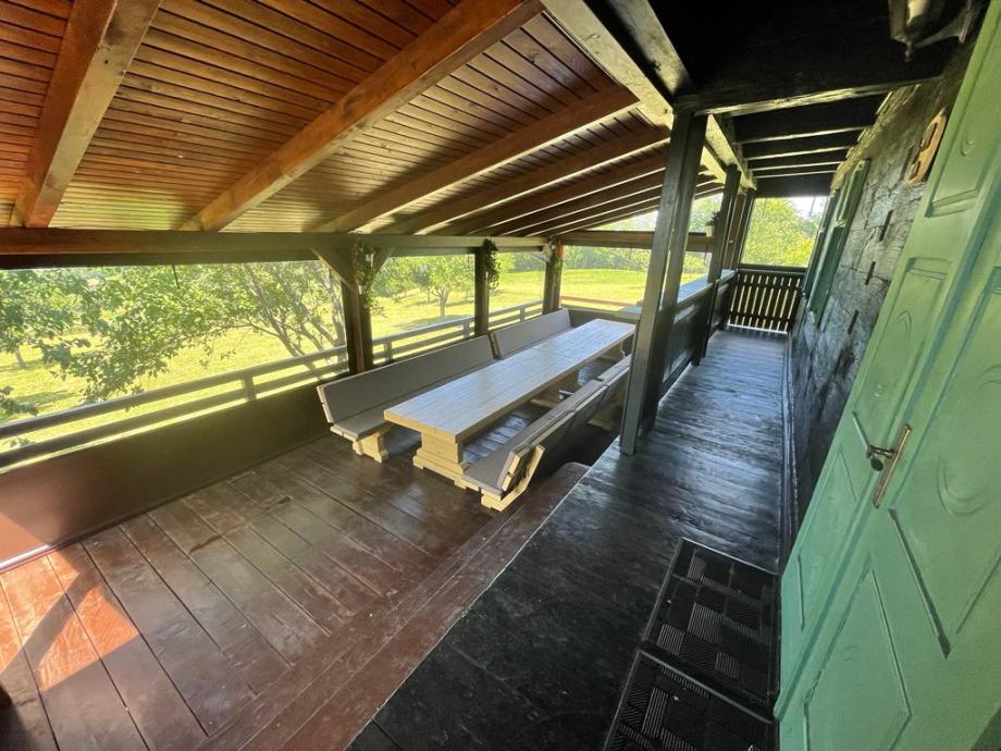 - drvena terasa ispred kuće, dijelom natkrivena i osvijetljena, na njoj su stolovi i klupe za 25 ljudi, (natkriveni dio moguće zatvoriti ceradom za boravak i u zimskim mjesecima)