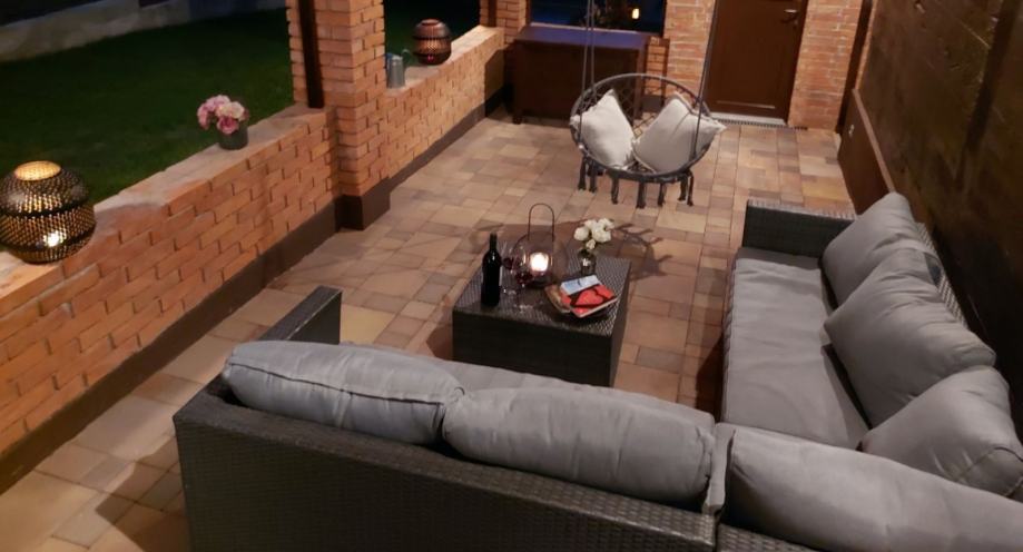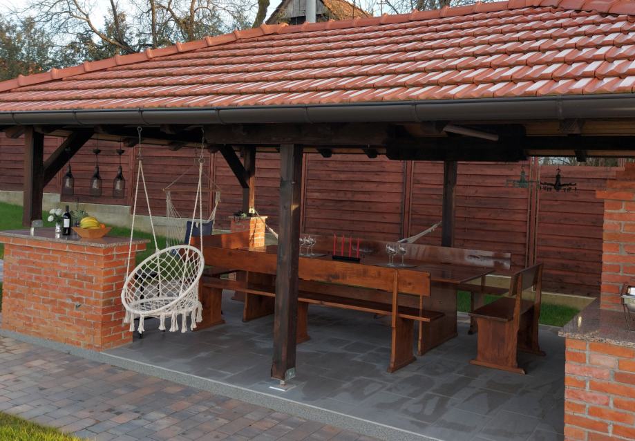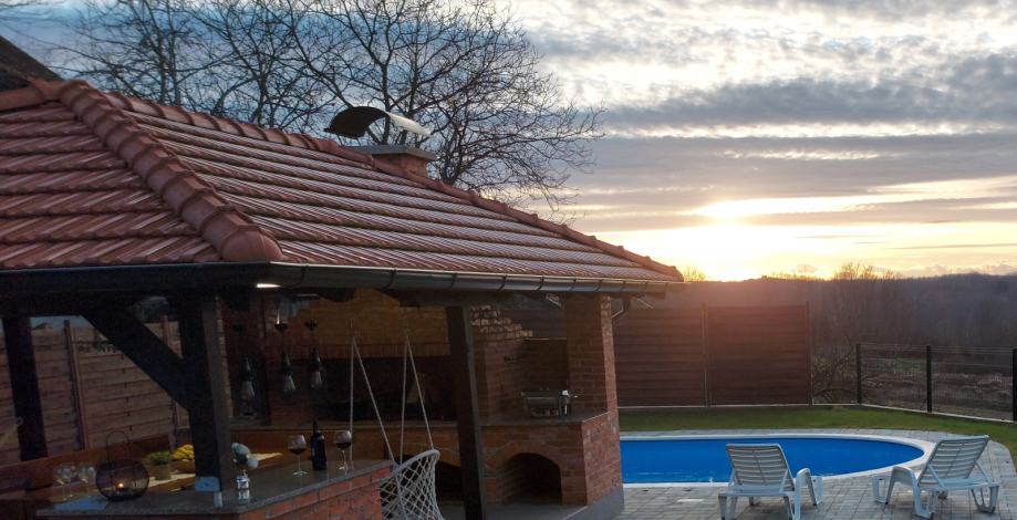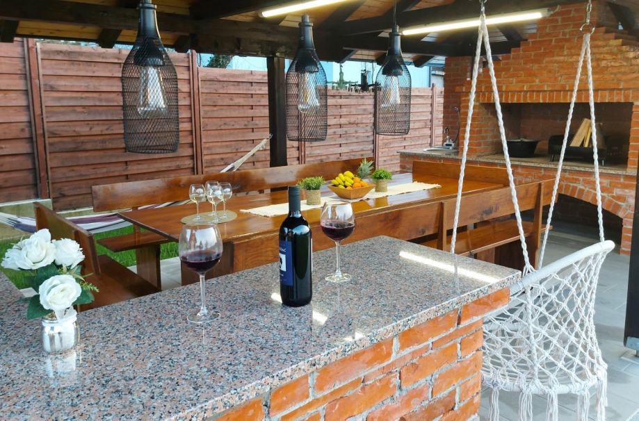 Vanjski dio na raspolaganju su bazen vanjski tuš, velika sjenica s masivnim stolom , roštiljom, kotlić,kotao za kotlovinu, drva za roštiljanje.