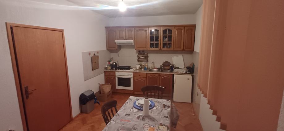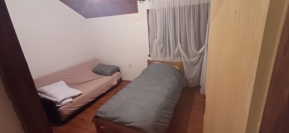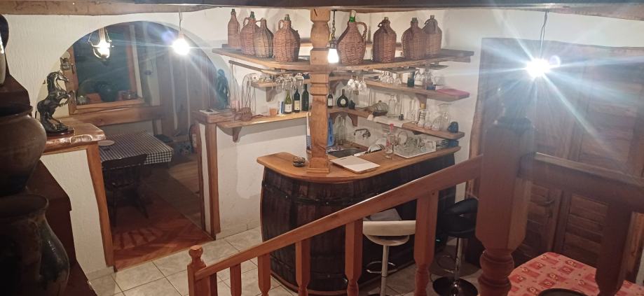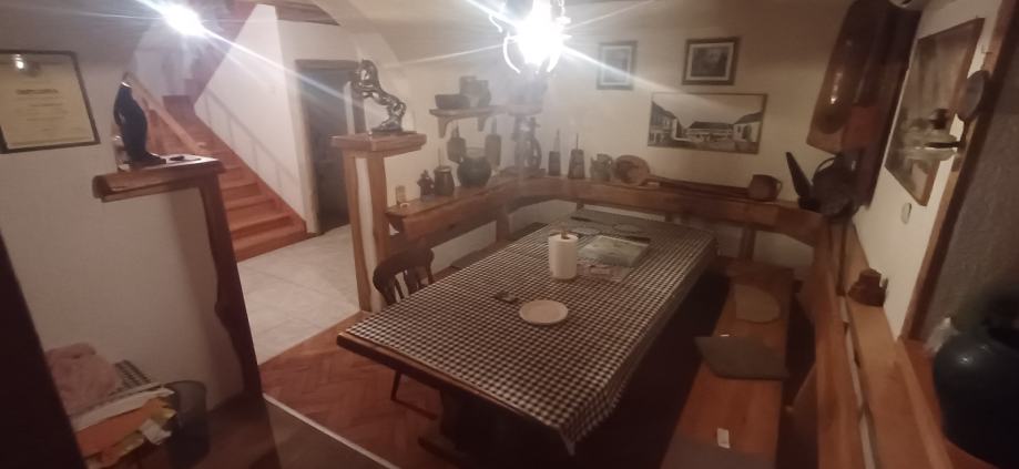 U donjem dijelu kuće ( prizemlje), nalaze se dvije primaće sobe sa drvenim separeima i šankom kapaciteta 20ak osoba, wc. Na 1.katu: kupaona, dnevni boravak, kuhinja i blagavaona.