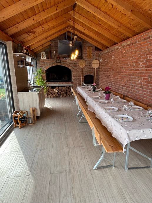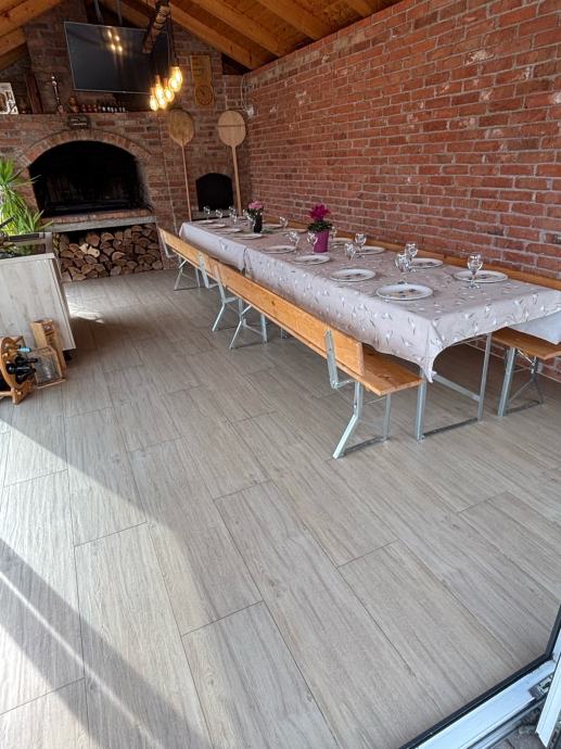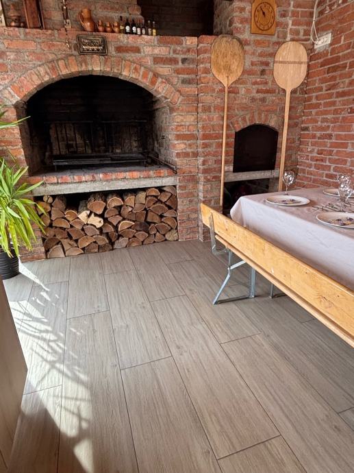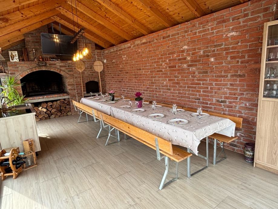 Opremljena sjenica s roštiljem i krušnom peći za druženja na otvorenom.