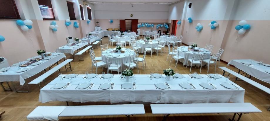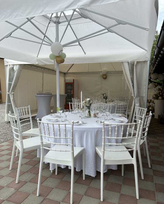 Naša oprema se ističe vrhunskom kvalitetom, a kako bismo ispunili sve Vaše potrebe, nudimo i široku paletu dodatne opreme: od elegantnih navlaka i stolnjaka, podova, do praktičnih grijalica i ambijentalne rasvjete. Ponosimo se konkurentnim cijenama – među najpovoljnijima smo na tržištu! Uz to, nudimo i specijalne popuste za veće najmove ili duže periode iznajmljivanja. Ako Vam je potrebna smjernica ili savjet oko opreme, tu smo da s iskustvom olakšamo Vaše planiranje.