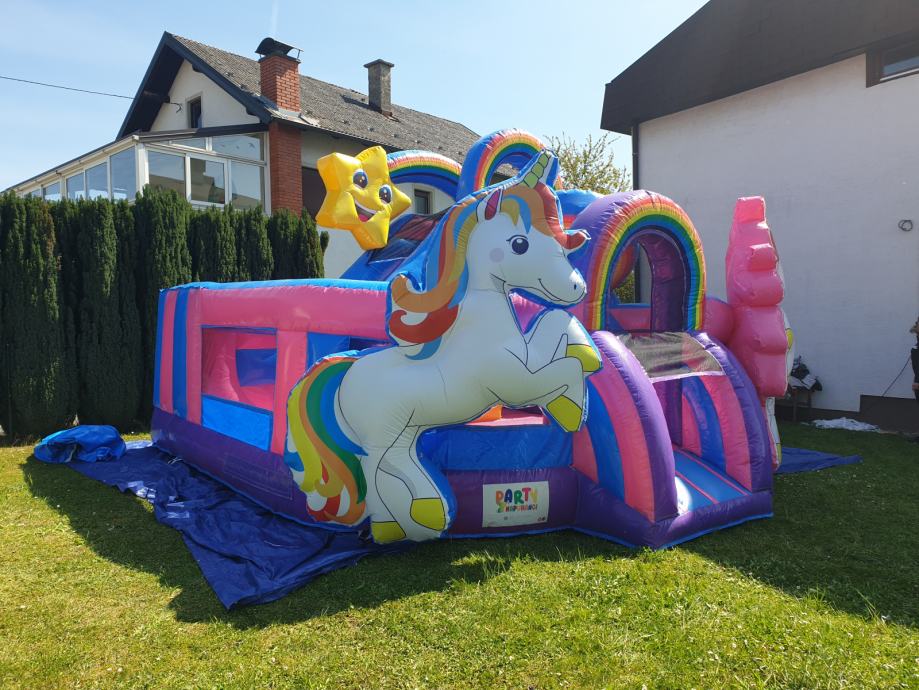 7. PARTY NAPUHANAC UNICORN (Jednorog) - prekrasan napuhanac u duginim bojama, tobogan, prostor za skakanje sa pregradama i stijena za penjanje - 80eur (Cijena za samopreuzimanje)