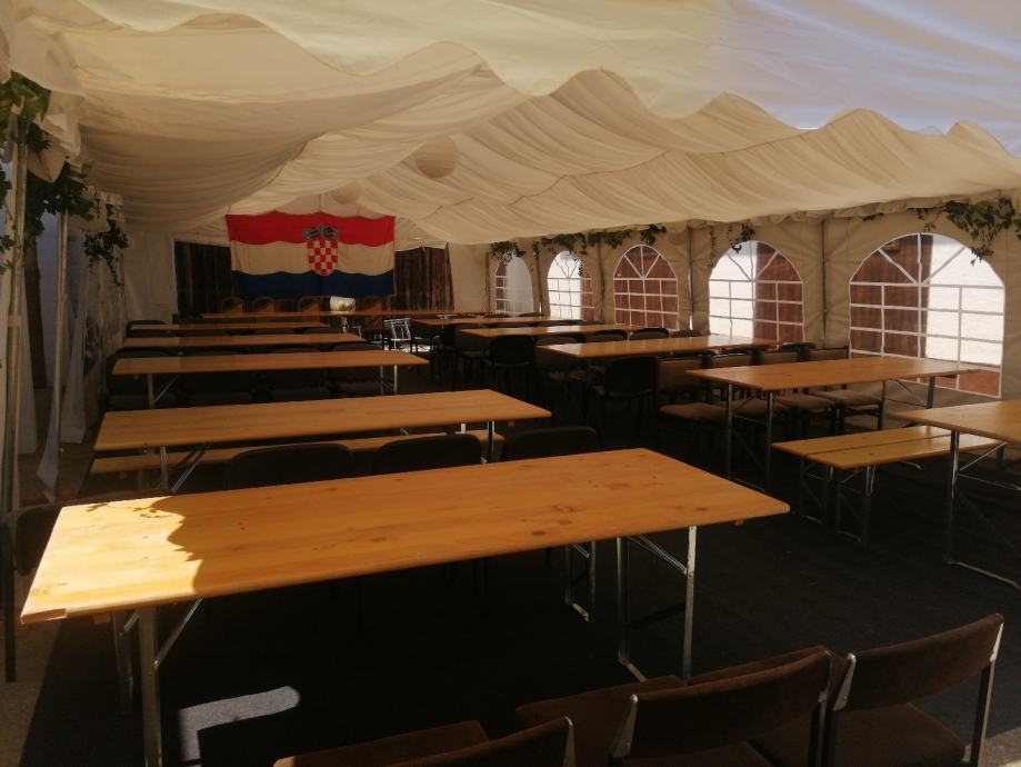 - paketi za 50 ljudi ( šator 4x8 ili 5x8 sa 6 pivskih garnitura sa klupama + 3 barska stola + 1 rashladna vitrina 1800kn)