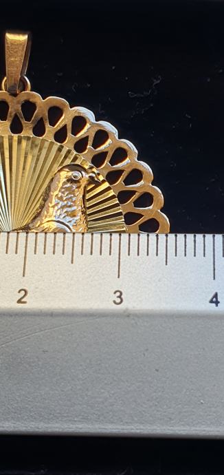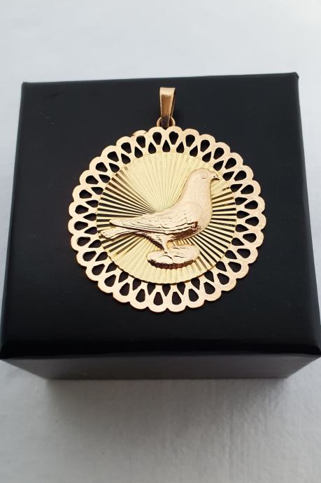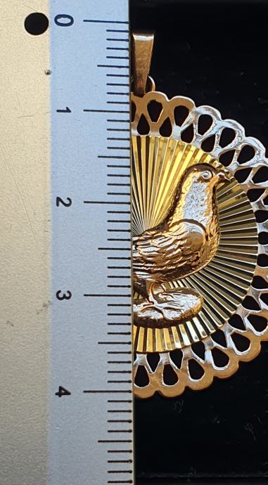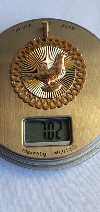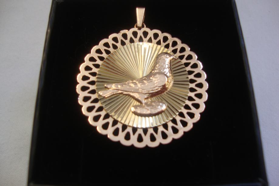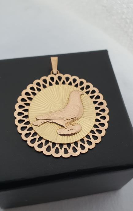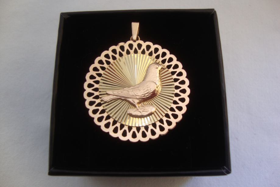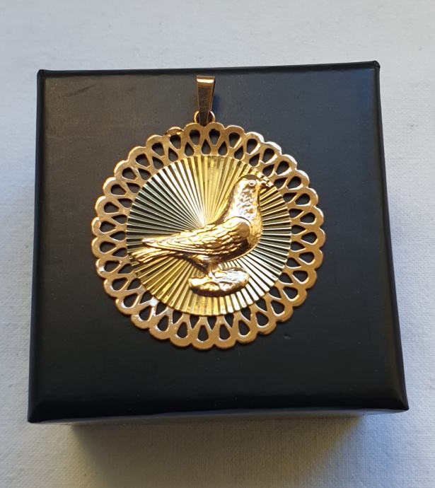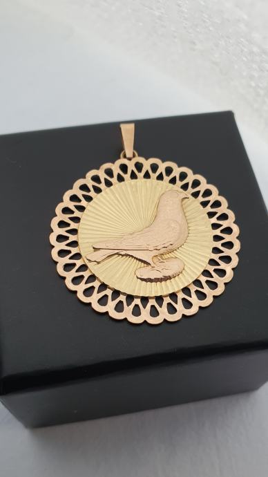 Antikni stari privjesak izrađen ručno od 18karatnig zlata (750) nema oznaku rad je vjerojatno po naruđbi i spada u staro zlato motiv je sa suncem ispred kojeg se nalazi golubica simbolizira Duha svetog treću božansku osobu u kršćanstvu Duh sveti se spustio na Isusa Krista u liku goluba kad se krstio na rijeci Jordan