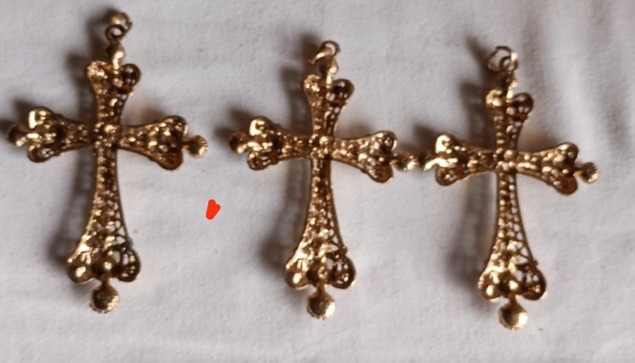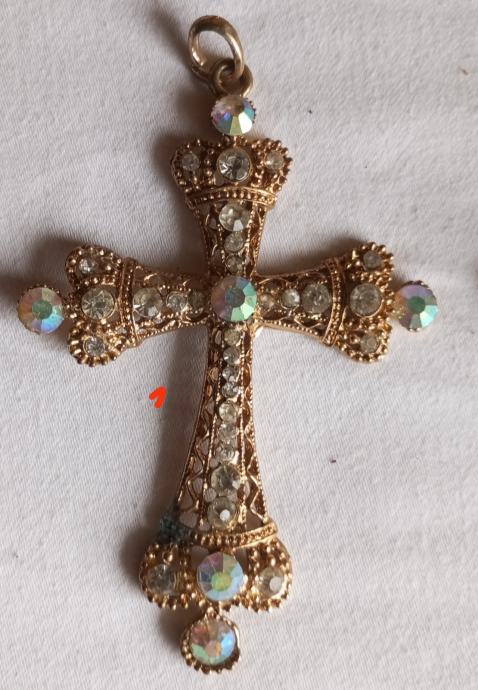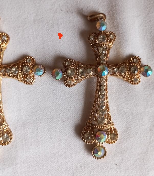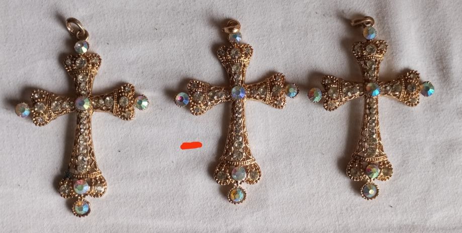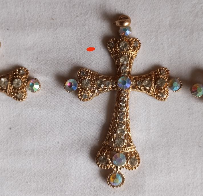 Prodajem novi privjesak u obliku križa izrađen od bižuterije. Privjesak je zlatne boje, ukrašen šljokicama i dekorativnim kamenčićima na krajevima. Dolazi s etiketom.