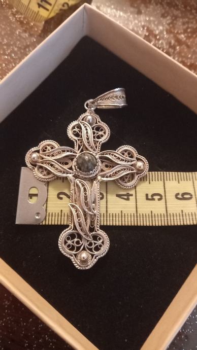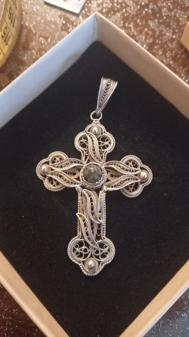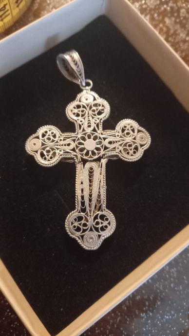 Prodajem rabljeni srebrni križ izrađen od kvalitetnog srebra s prekrasnim filigranskim detaljima. Privjesak ima elegantne ukrase i dekorativne elemente koji mu daju poseban izgled. Idealan je kao modni dodatak ili poseban poklon za nekoga kome je stalo do jedinstvenog komada nakita.Križ je bio slomljen ali je sastavljen kod zlatara vidljivo otraga,dimenzija na slici