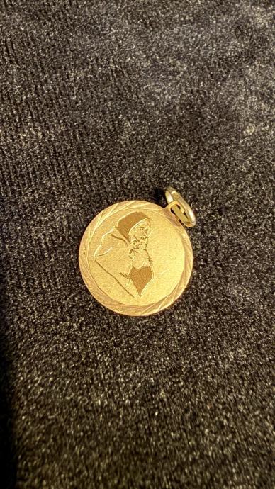 Prodajem zlatni privjesak izrađen od zlata 14k (585) finoće. Ukupna težina privjeska iznosi 0,94 grama. Okruglog je oblika s gravirani motivom i dekorativnim rubom, a na vrhu se nalazi petlja za vješanje na lančić.
