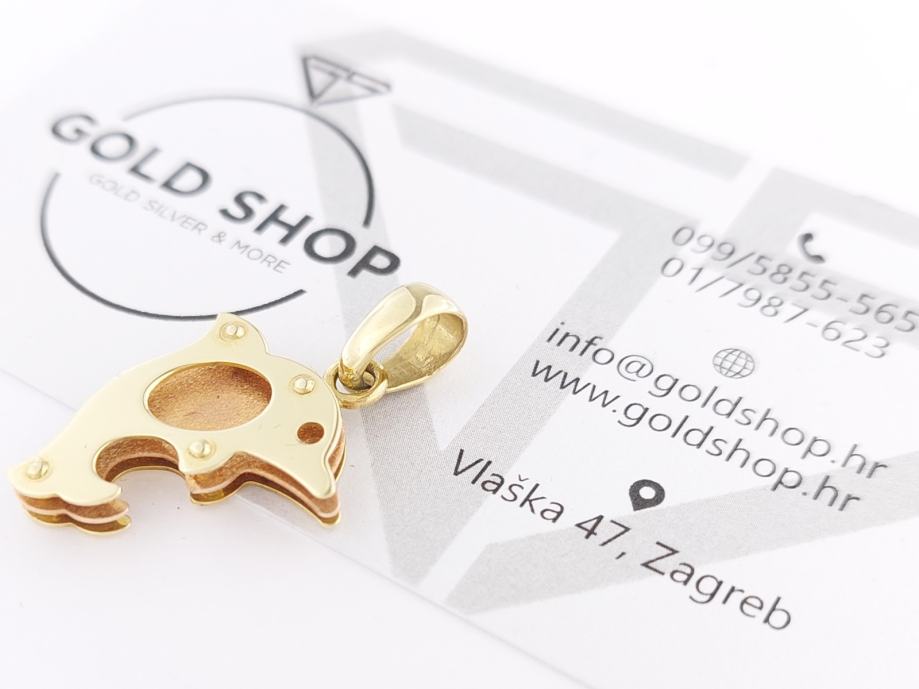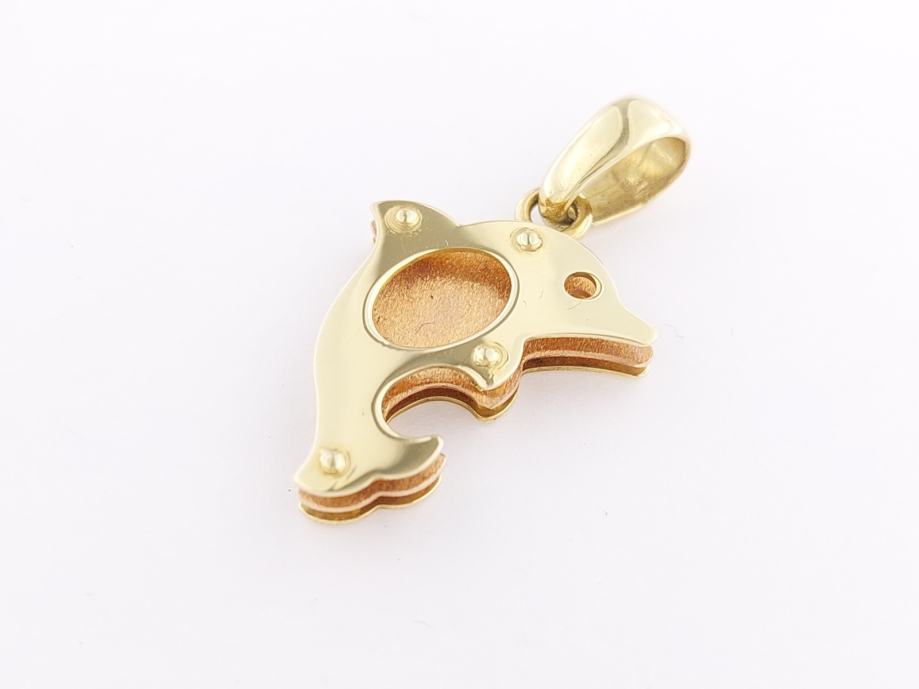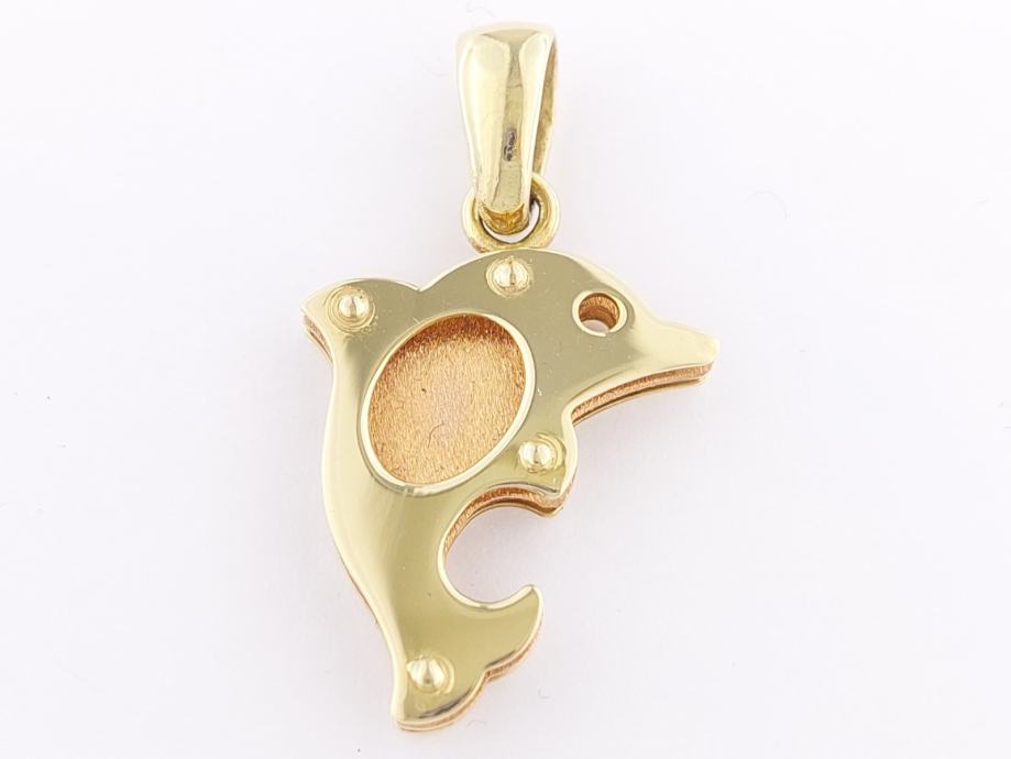 Zlatni privjesak delfin, kombinacija žuto-crveno zlato 14K, štambilj 585, mat-glat kombinacija, trokutasta karika za lančić.
