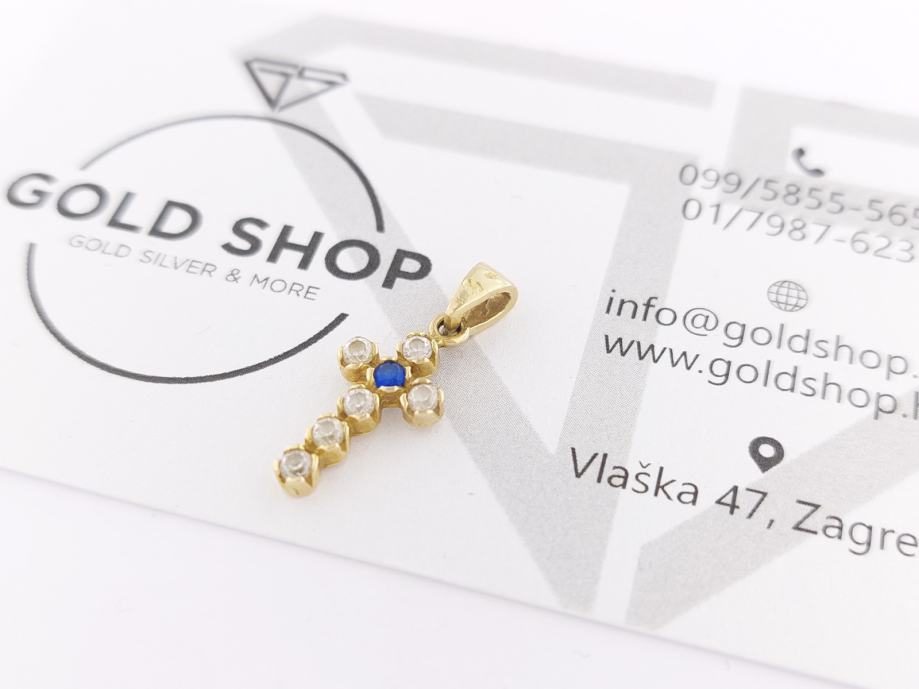 Zlatni privjesak križić, žuto zlato 14K, žig 585, trokutasta karika za lančić, bijeli cirkoni + 1 plavi cirkon u sredini.