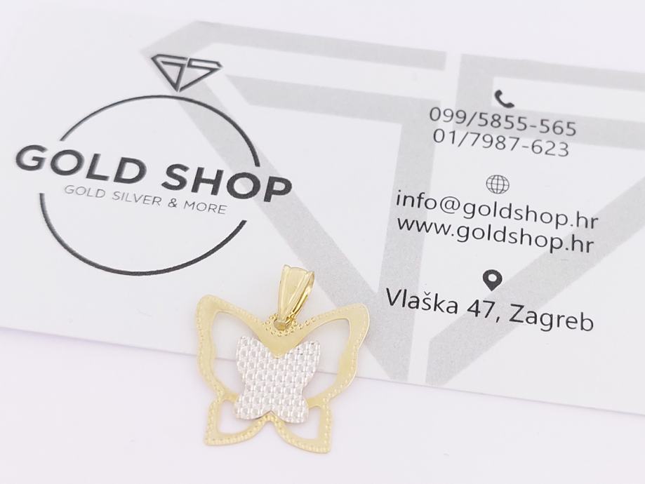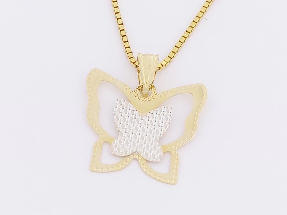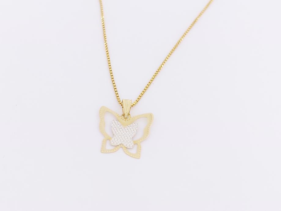 Zlatni privjesak leptirić, kombinacija žuto-bijelo zlato 14K, žig 585, trokutasta karika za lančić.