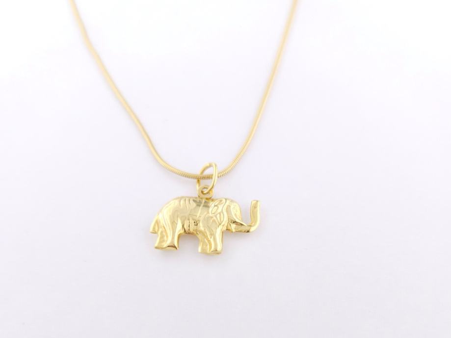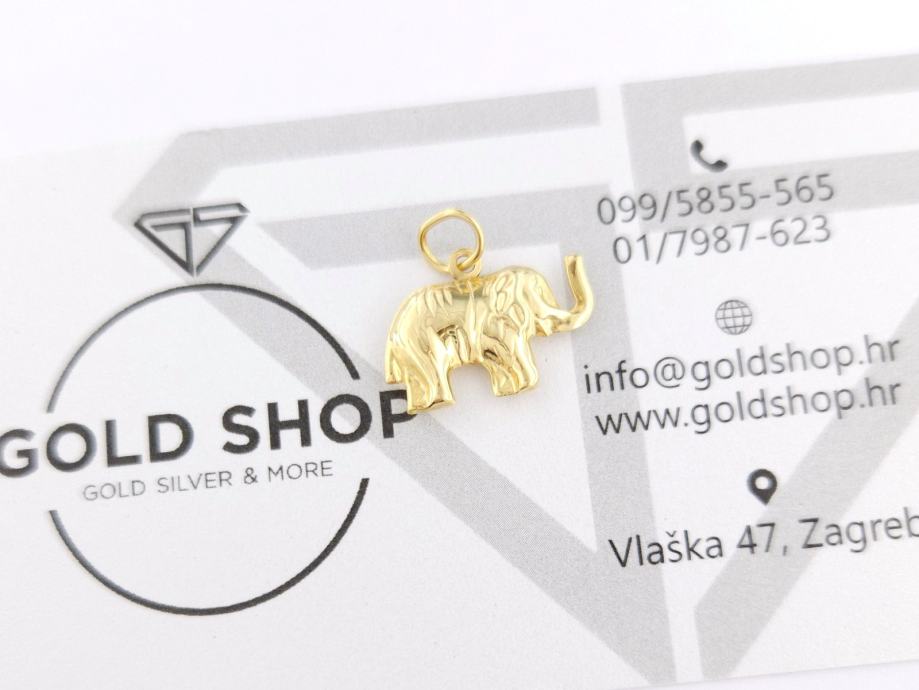 Zlatni privjesak slonić, glat s reckicama, žuto zlato 14K, žig 585.