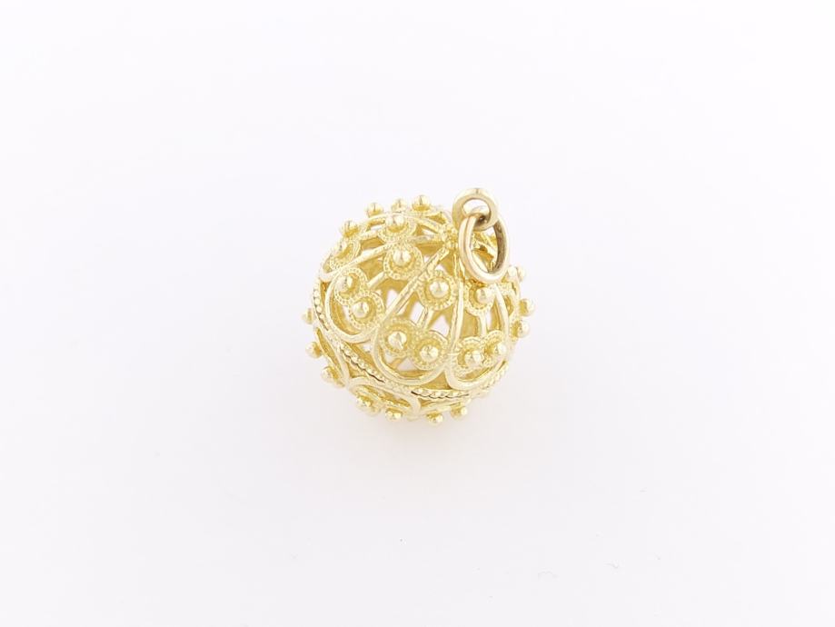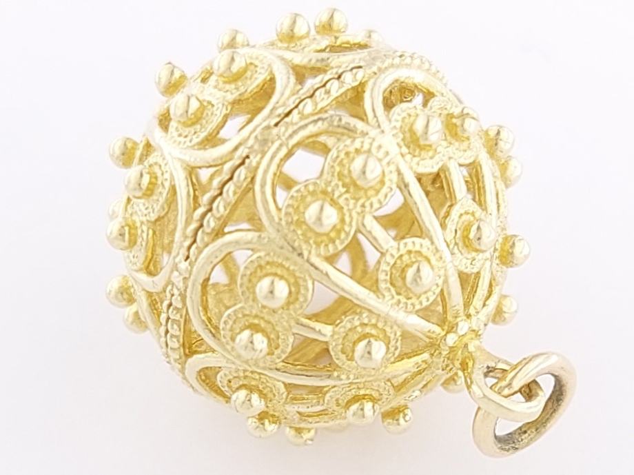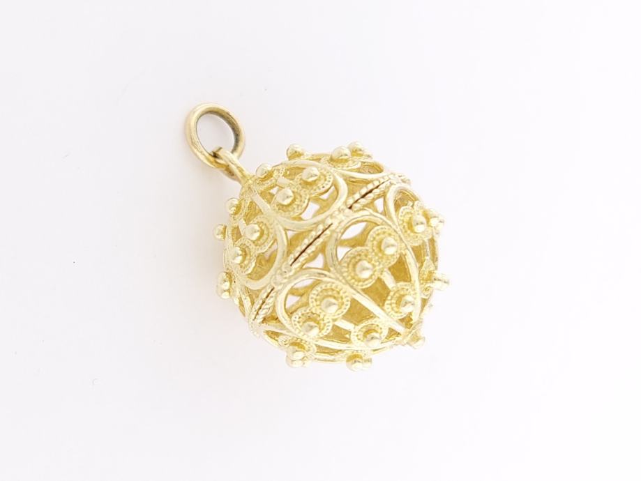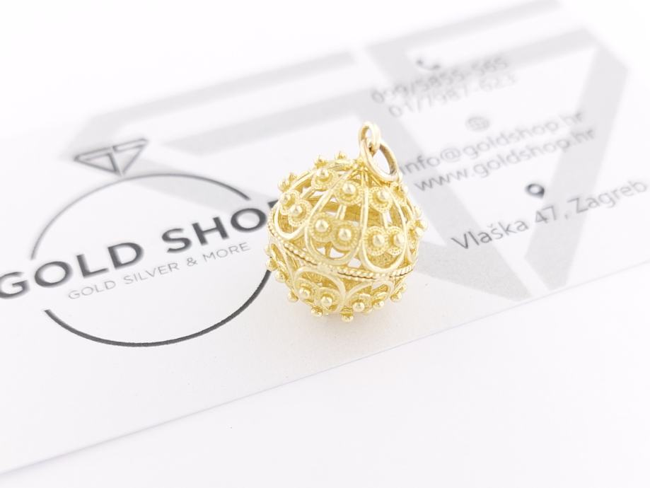 Zlatni privjesak šibenski botun, tradicionalni hrvatski nakit, ručni rad, kuglica, žuto zlato 14K, žig 585.