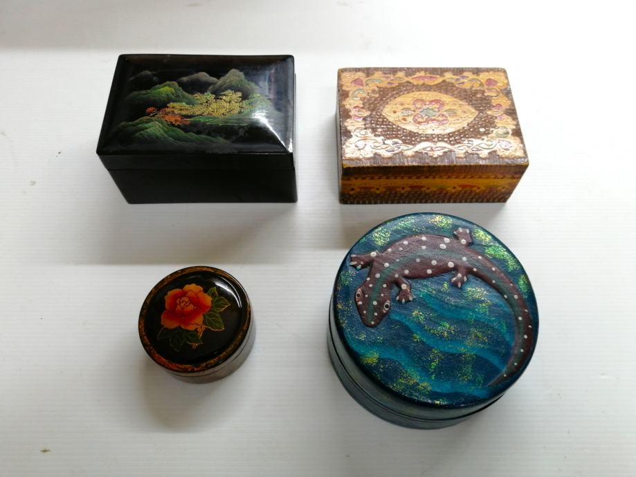 Kutije za nakit 4kom; slika 2 veličine 12cm Ø x 7cm, slike 3, 4 veličine 7cm Ø x 3cm, slika 5 veličine 13 x 9,5cm, slike 7, 8 veličine 14cm x 10cm x 7cm.