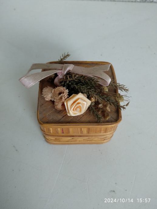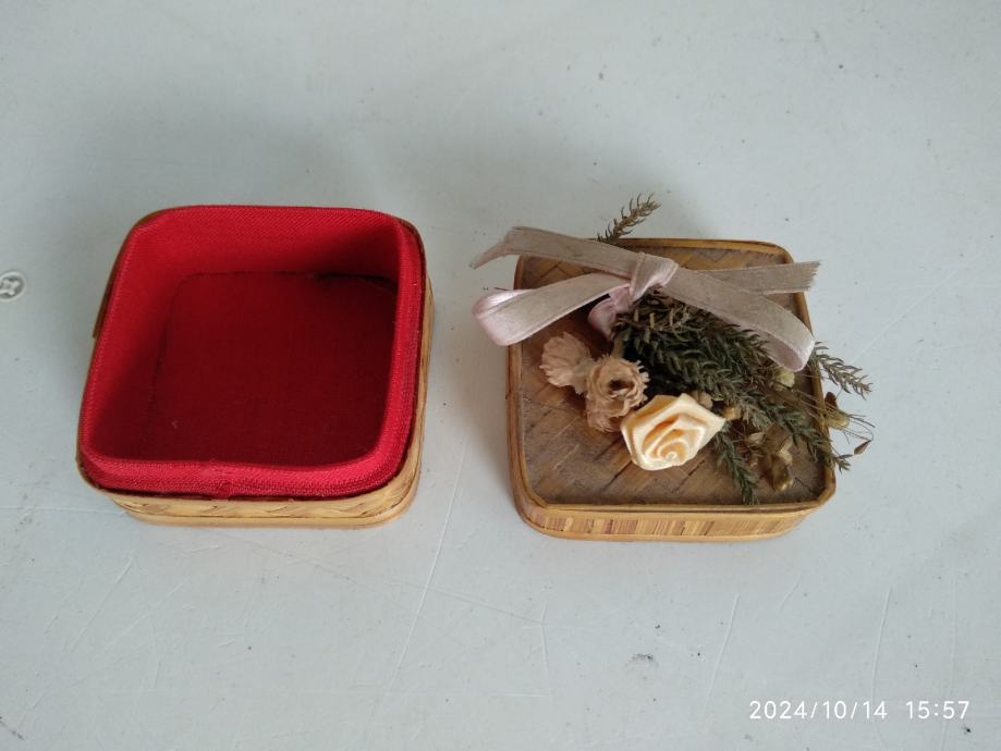 Kutijica je od plastičnog materijala, koji imitira drvene lamele, koje isprepletene formiraju vanjske površine kutije.