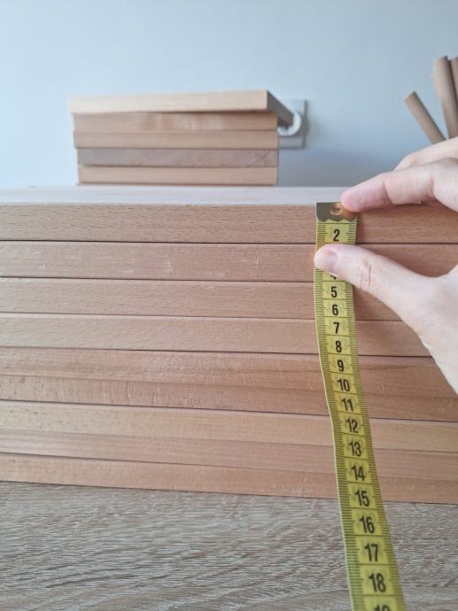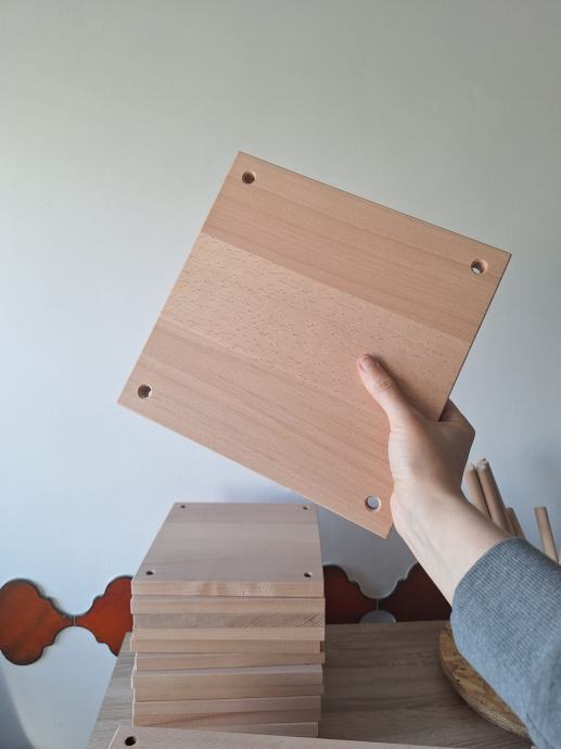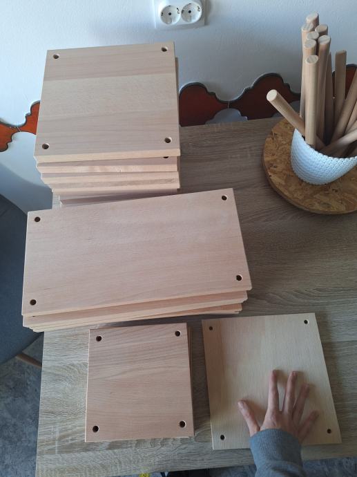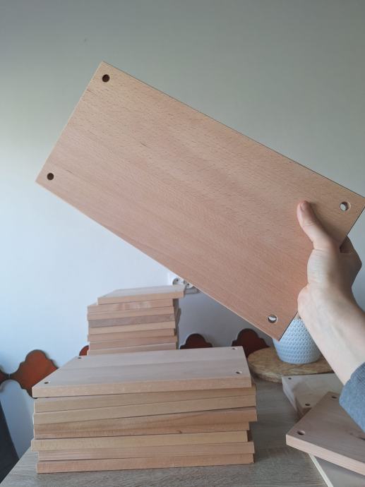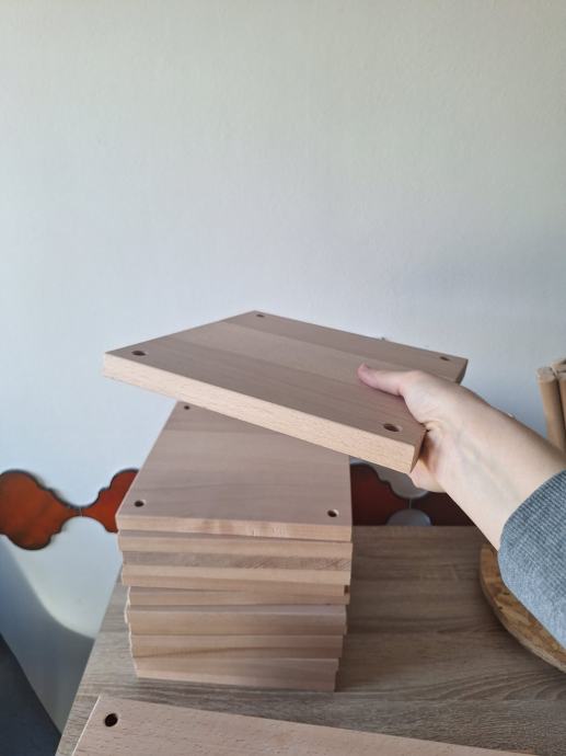 Izrađeno po mjeri od kvalitetnog punog bukovog drva. Svaka daska ima probušene rupe jer sam ih ja koristila kao zidne makrame police u uređenju interijera, a štapove za mnoge diy projekte.