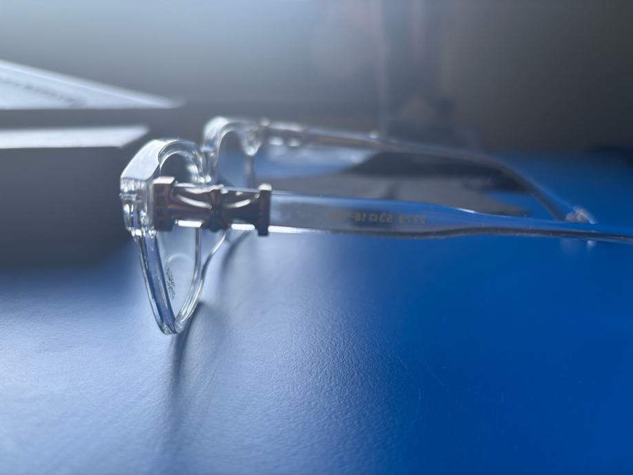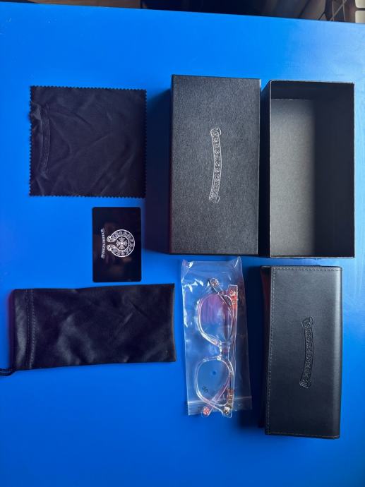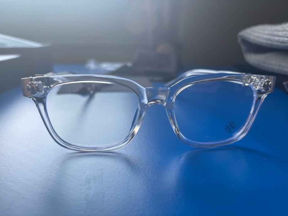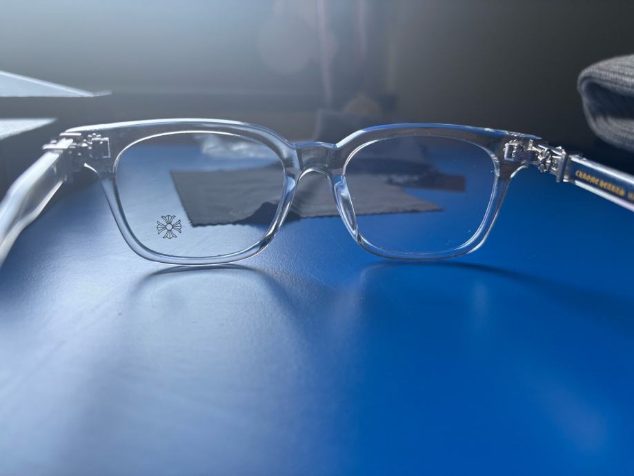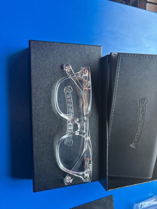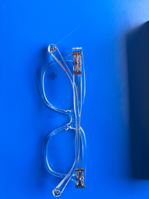 Prodajem Chrome Hearts naočale za plavo svjetlo, stanje novo bez etikete. Okvir je prozirne, kristalno bistre boje s pravokutnim oblikom koji pristaje većini oblika lica. Na stranicama su vidljivi karakteristični Chrome Hearts detalji i logotip brenda. Dolaze s kutijom.