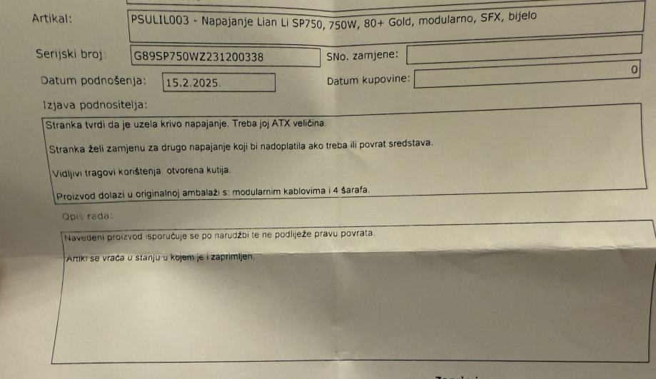 Napajanje je doslovno novo, samo otvoreno. Nije spajano ništa. Dolazi s računom i garancijom. Plaćeno 148€