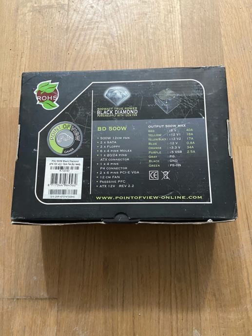 Max. output: 500W 12cm fan ATX 12V REV 2.0 Passive PFC 4x SATA 2x Floppy 1x 4x4 Pins Molex 1x 20/24 pins ATX connector 1x 4 pins P4 connector 2x 6 pin PCI-E VGA (connector voor SLI) Voltage: Red = +5V/15A Yellow = +12V1/18A Yellow/Black = +12V2/16A Blue = -12V/0.3A Orange = +3.3V/24A Grey = P.G. Black = GND Green = PS-ON