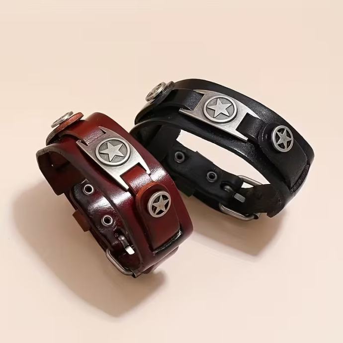 2 komada visokokvalitetne punk rock PU kožne muške narukvice, dizajn s petokrakom zvijezdom od legure cinka - moderna smeđa i crna narukvica, oštar ručni zglob, izdržljivi dodatak za ručni zglob, modna narukvica za muškarce, ljubitelje ulične mode