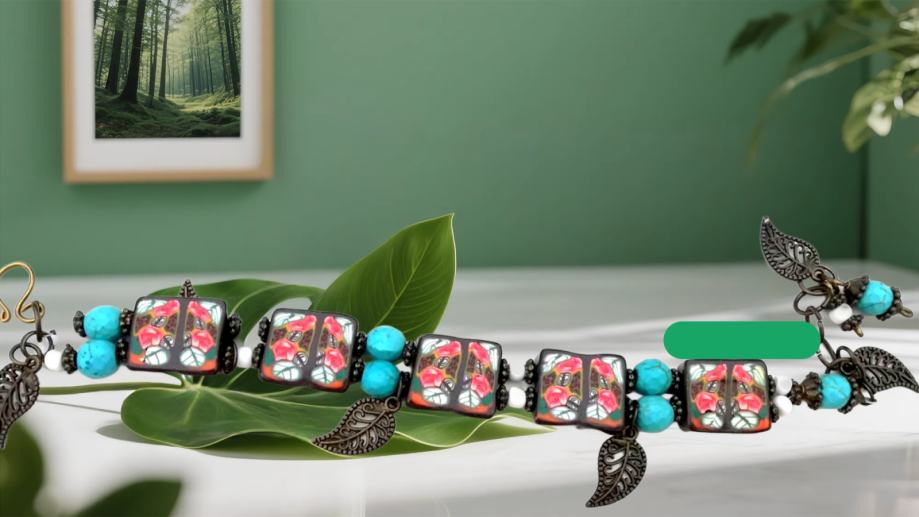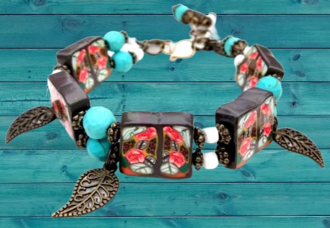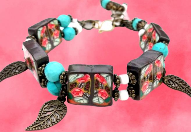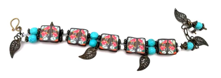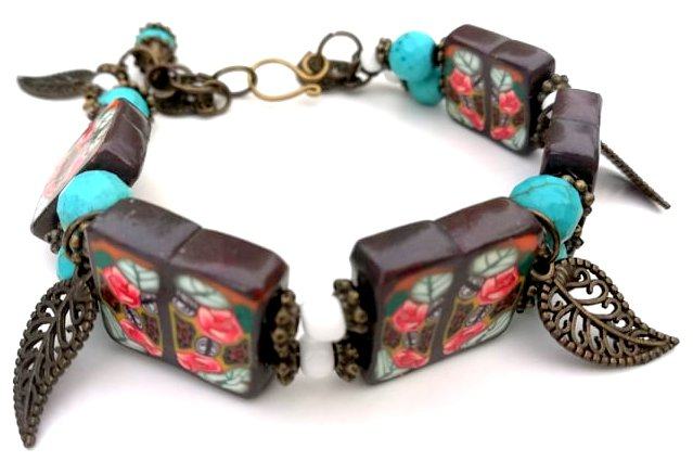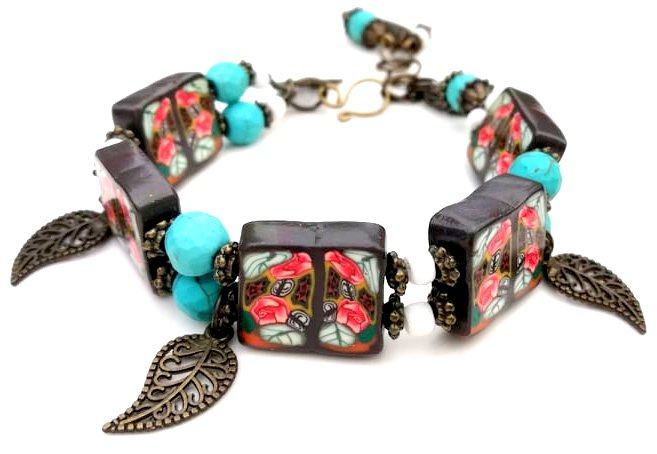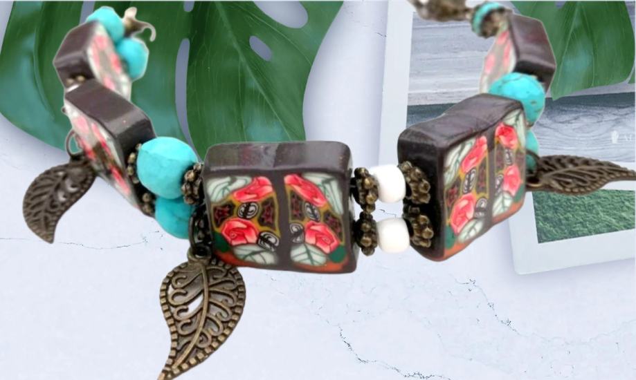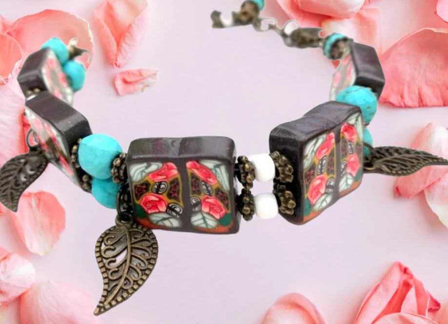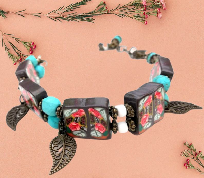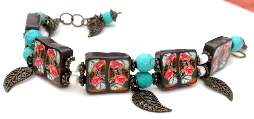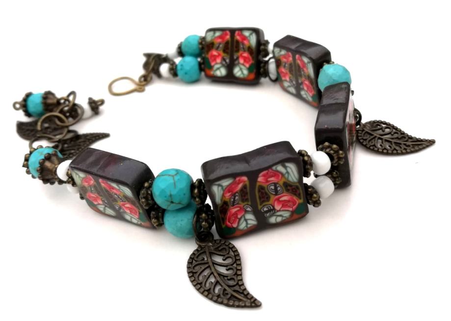 Art narukvicaod polimerne gline izrađena od ručno oblikovanih perli dizajniranih sa sitnim caneovima u obliku ruža, također ručno oblikovanih posebnom tehnikom od polimerne gline. Pet četvrtastih handmade perli poliranih do sjaja spojene su elastikom i vezane posebnim zaštitnim čvorom. Dodane su im tirkizne perle, nekoliko staklenih bijelih perlica te mesing ukrasi. Malo umjetničko djelo za zglob ruke od 16-20 cm jer ima dodane ringiće da podešavanje. Unikat.