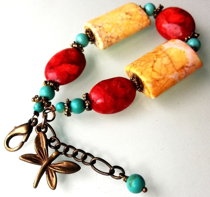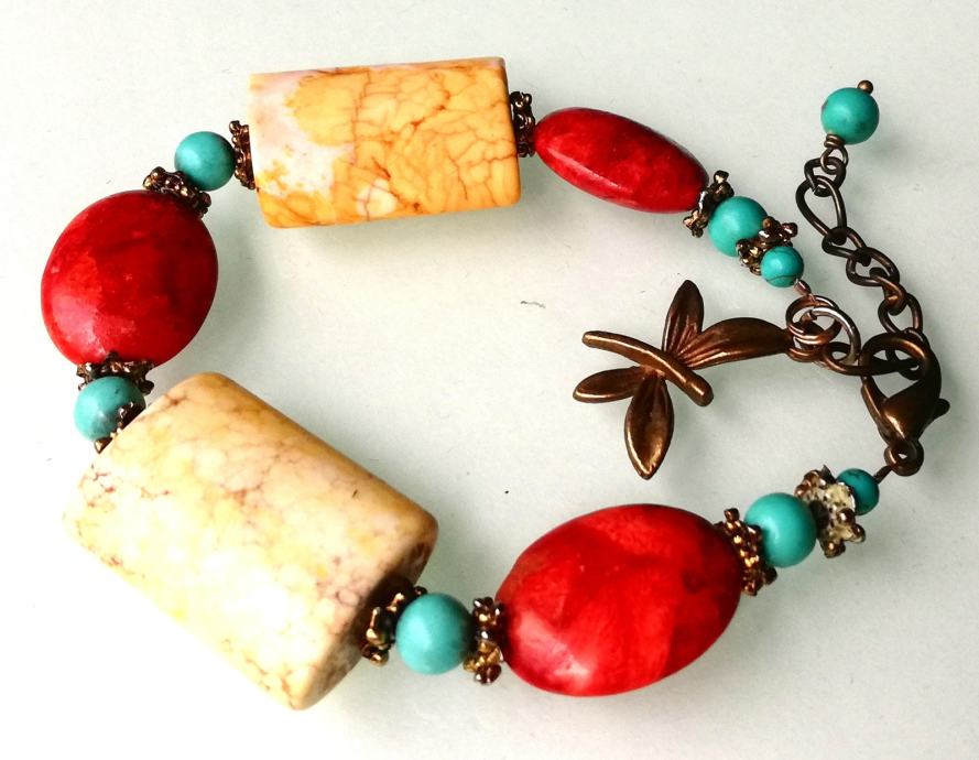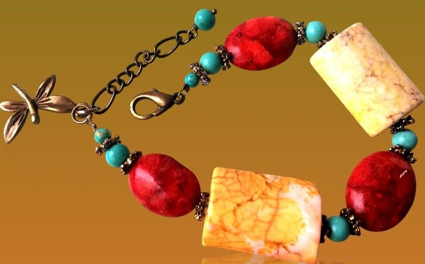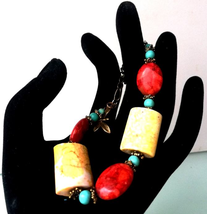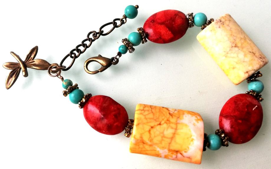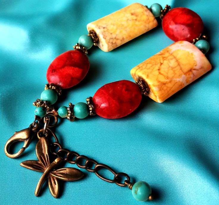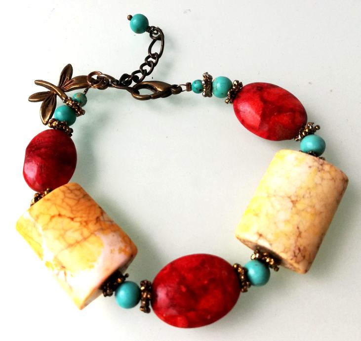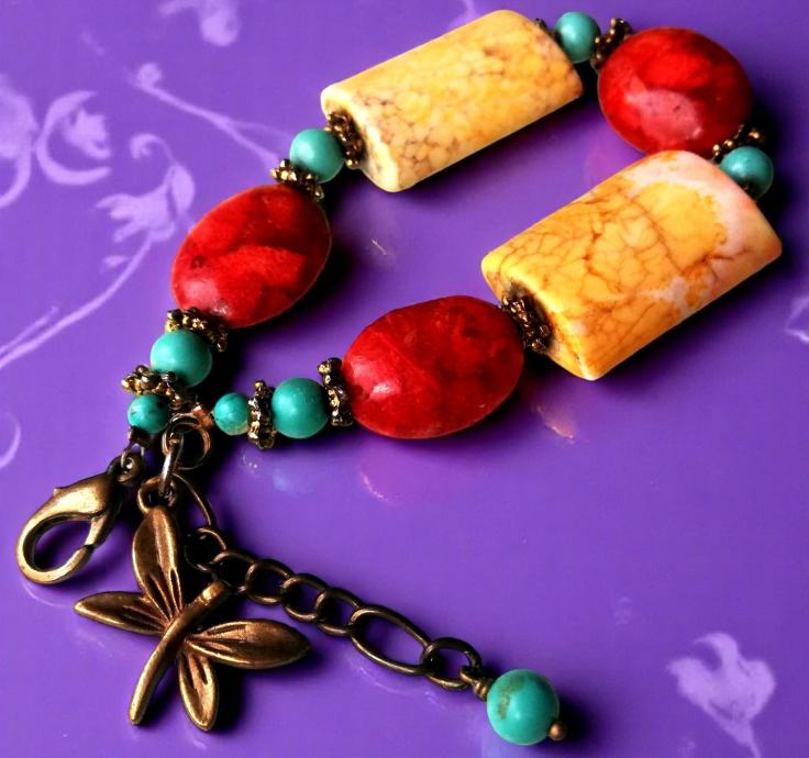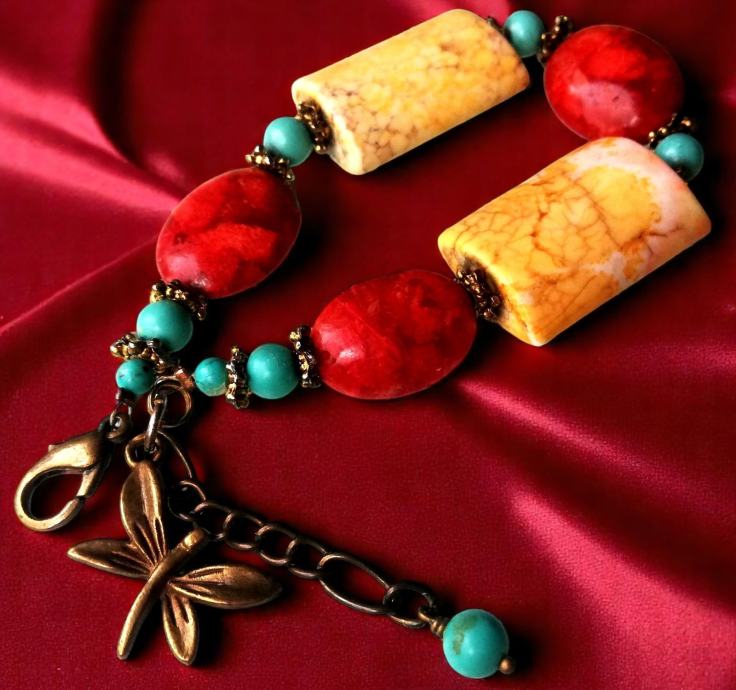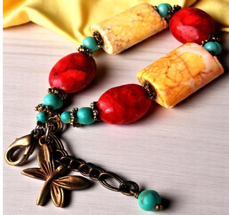 Art narukvica od poludragih perli ukrašena mesing ukrasima. Ima podesivi lančić. Unikat. Ručni rad.