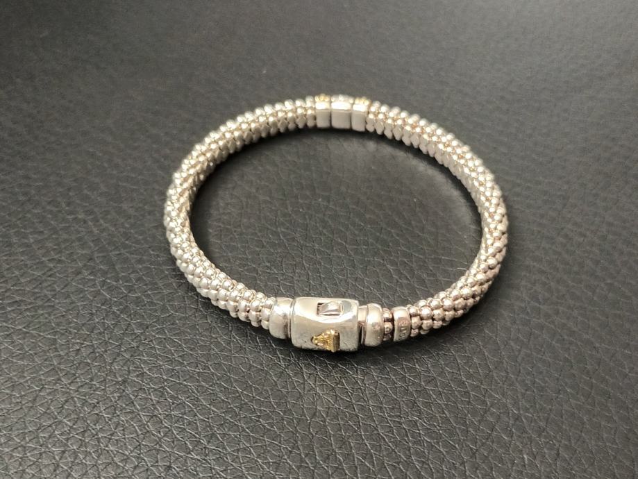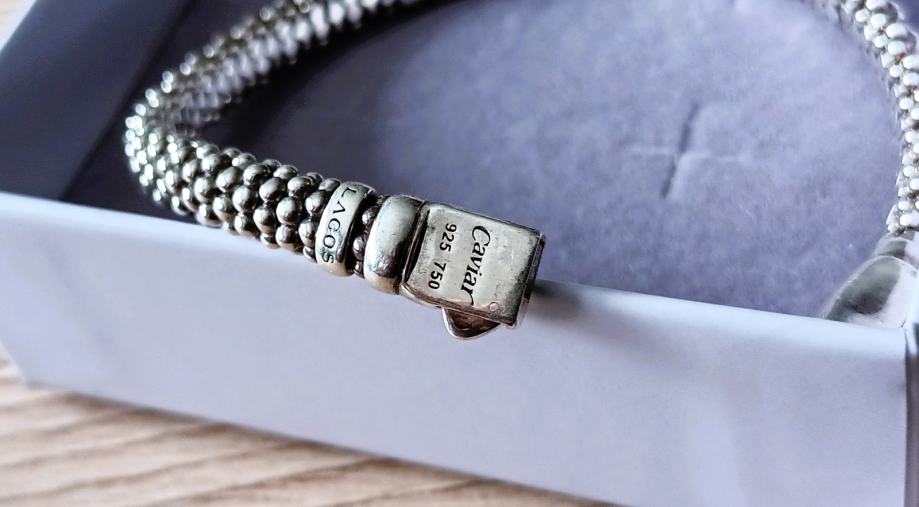 Dizajnerska damska narukvica "Caviar" model "Lagos",izradjena od srebra sa zlatnim karikama.Obogacena sa 8 dijamanata ukupne tezine 0.25ct.
