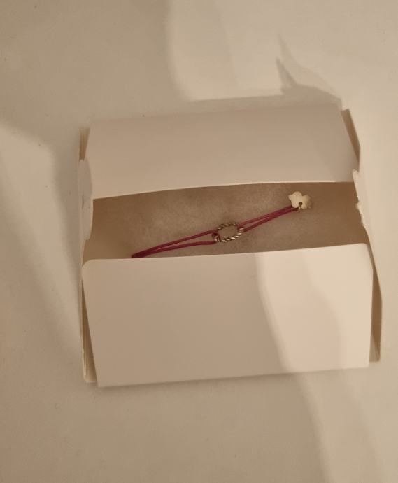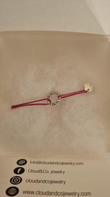 Cloud narukvica, nova, nikad nosena u orginal kutiji kojoj je kopca prilikom otvaranja pukla. Narukvica je kombinacija srebrnog privjeska i antique pink špagice.