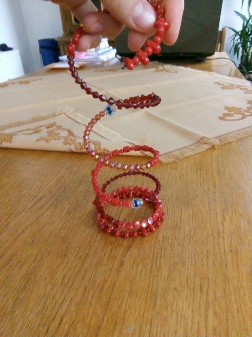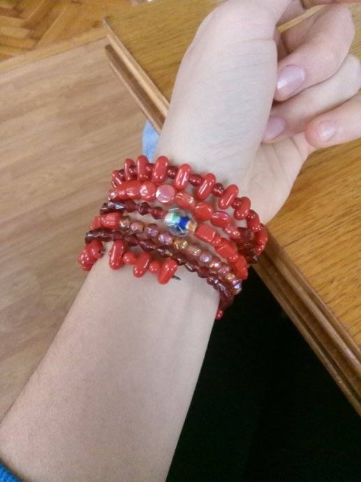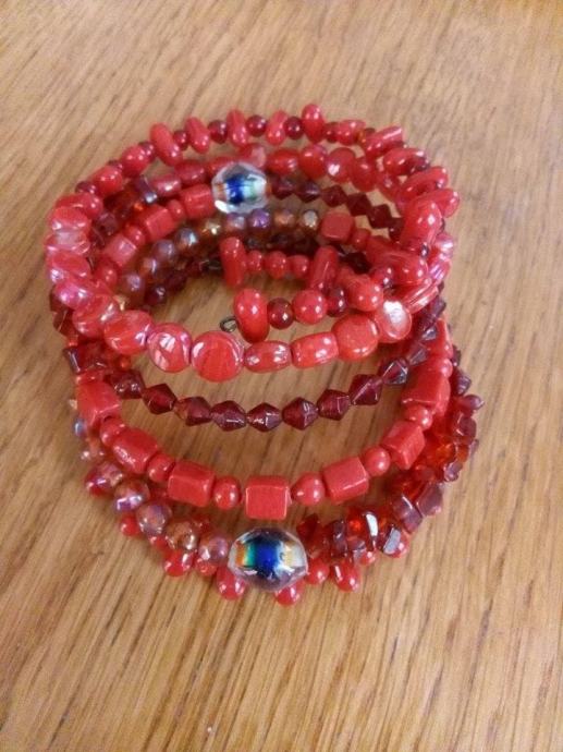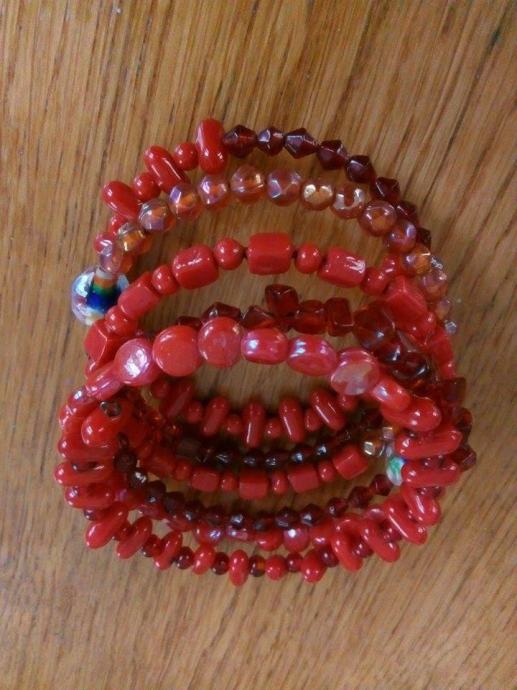 Crvena narukvica, nova, nizane veće perlice, formira se na ruci, lijepo stoji.