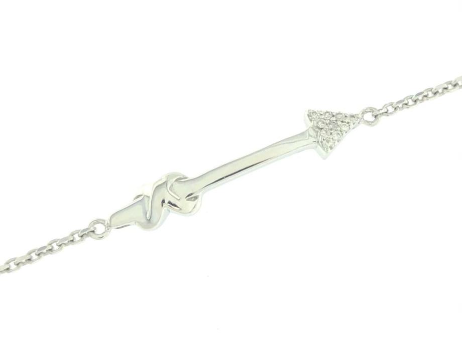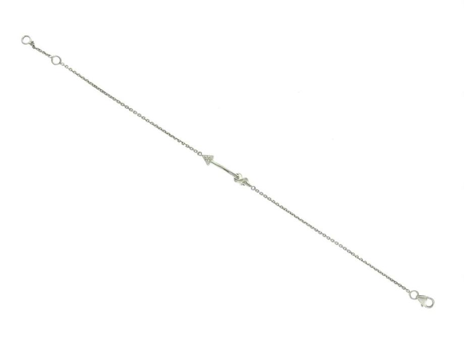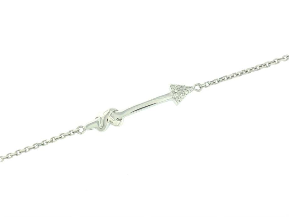 Zlatna narukvica, ženska, tanki erbskare lančić, na sredini glat strelica - znak beskonačnosti, u vrhu strelice 10 malih dijamantića 0.003ct, bijelo zlato 18K, žig 750. Narukvica ima karičicu za skraćivanje.