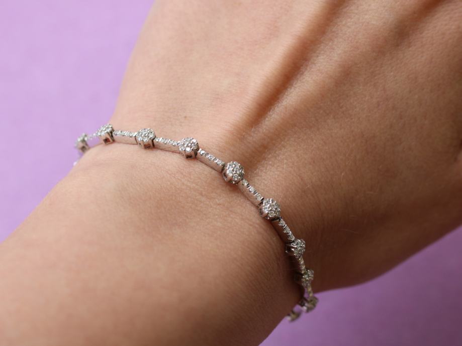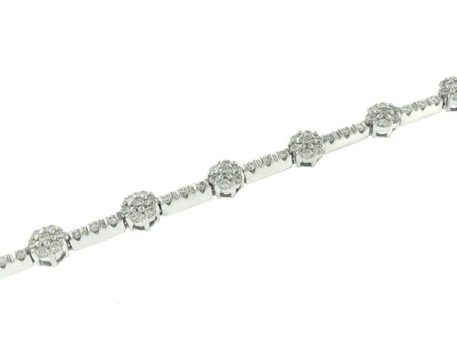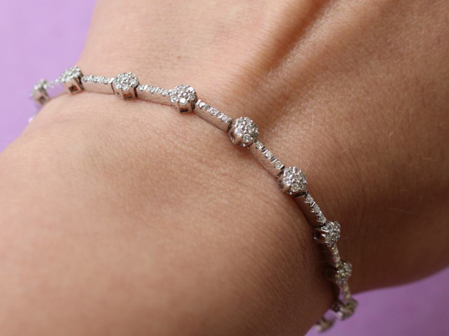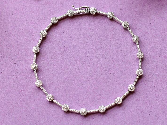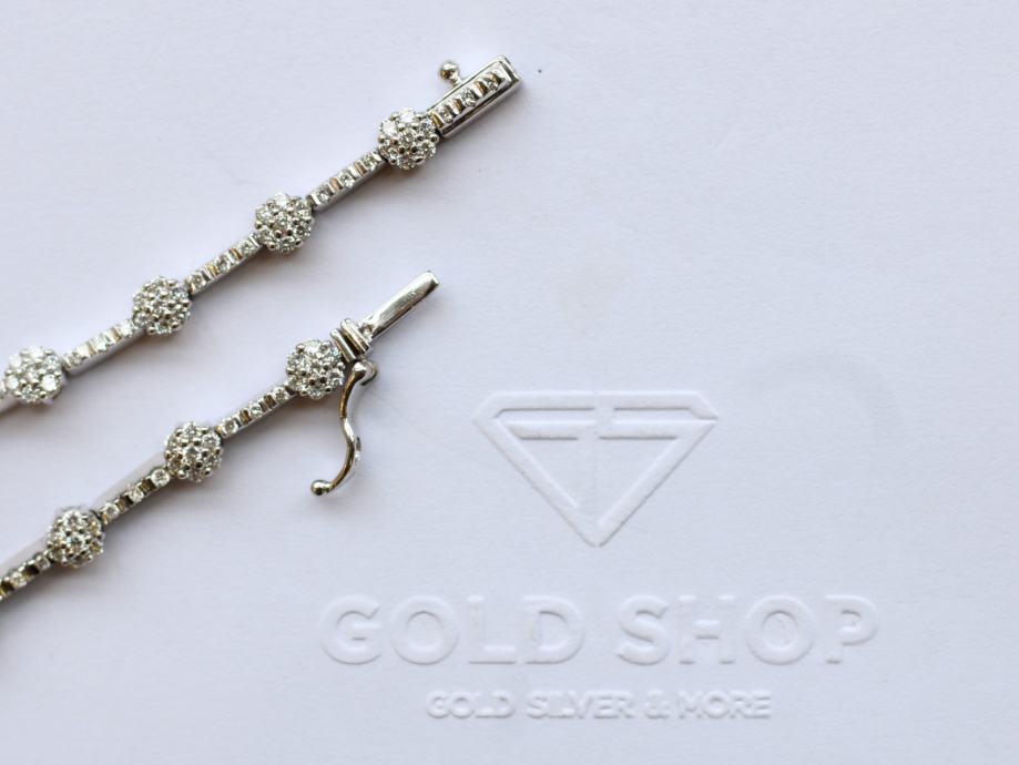 Svaki segment ispunjen je dijamantićima, 180 komada × 0.008ct, bijelo zlato 18K, žig 750, kopča - "sigurnosna osmica".