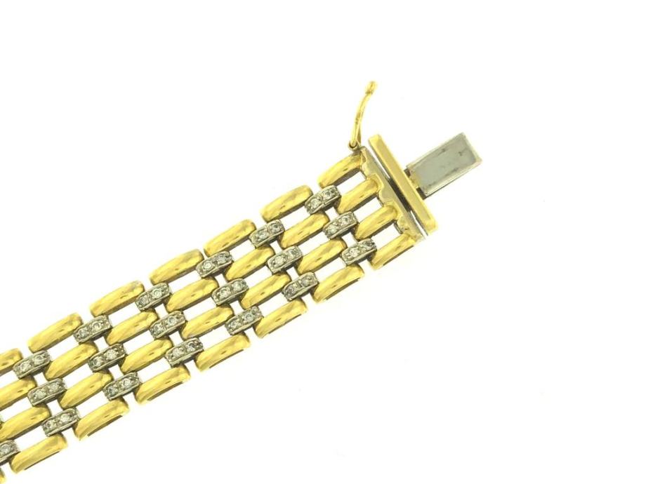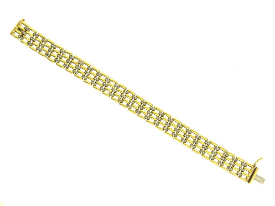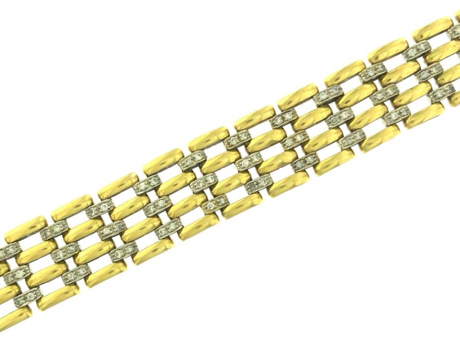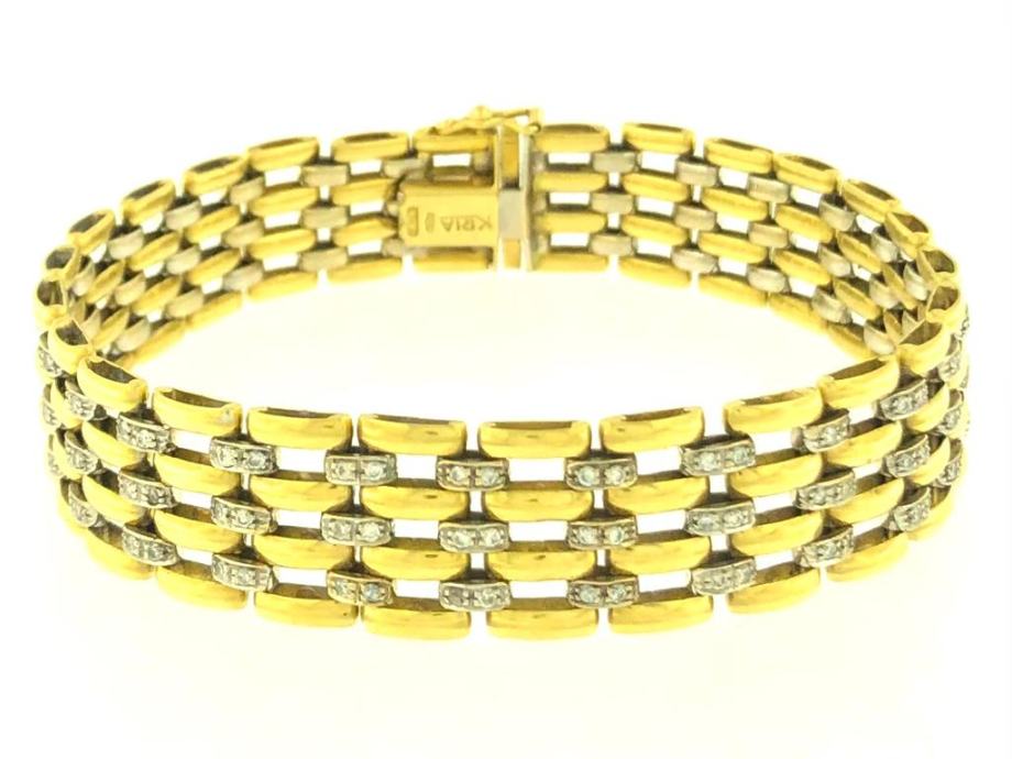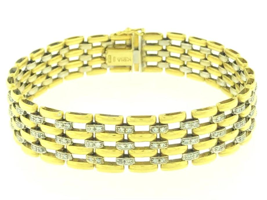 Zlatna narukvica, ženska, deblja sa 150 dijamantića 0.005ct, brand Kria, kombinacija žuto-bijelo zlato 18K, žig 750, kopča - "sigurnosna osmica".