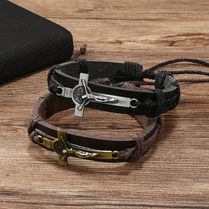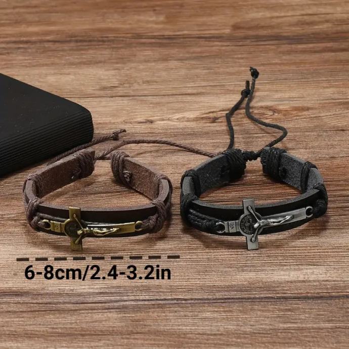 1 kom elegantna kršćanska narukvica s križem za muškarce - crna umjetna koža sa zlatnim privjeskom, idealna za rock, hip-hop i zabave, svečani dodatak | elegantan dodatak | izdržljiva umjetna koža, kršćanski dodaci.
