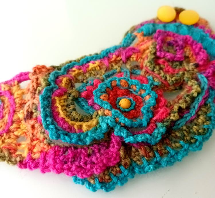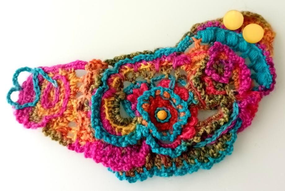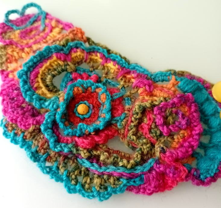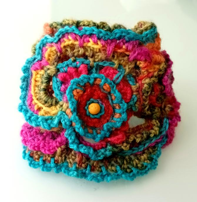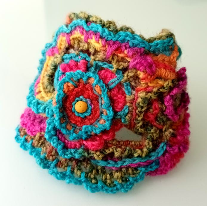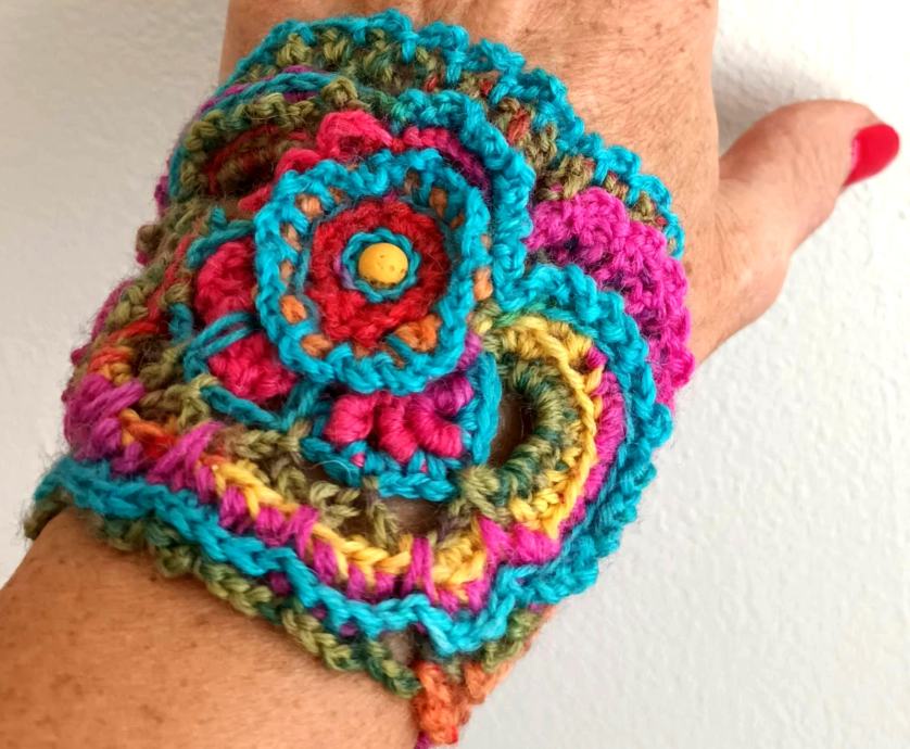 Ručno heklana narukvica sa cvjetnim motivom izrađena od vune i pamučno konca. Unikat.