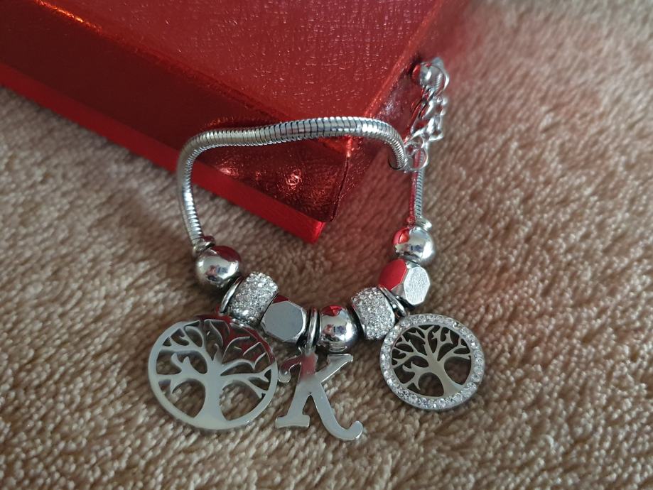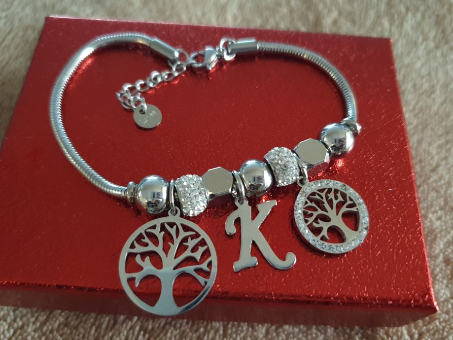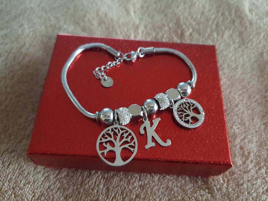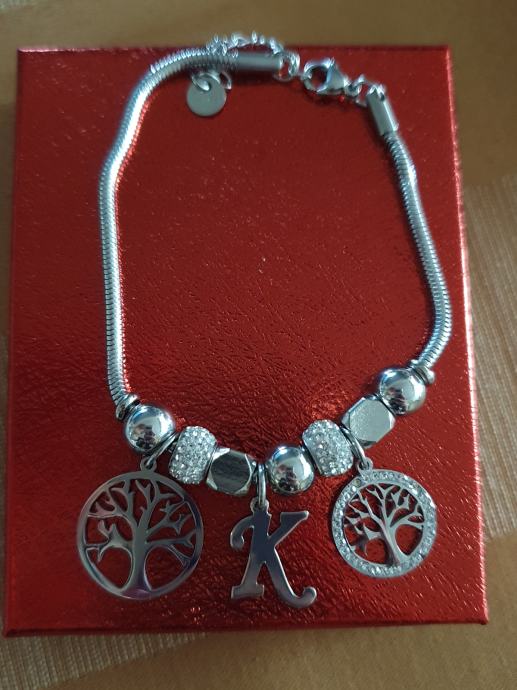 Narukvica je personalizirana što znači da birate privjeske na njoj (slovo, djetelina, srce, zvijezda, djevojčica, drvo života, anđeo, čudotvorna medaljica Majka Božja, križić, anđeosko krilo, sidro, zvijezda, sv.Benedikt, jednorog, slonić, sova, šapa, obitelj, djevojčica i dječak, itd.)