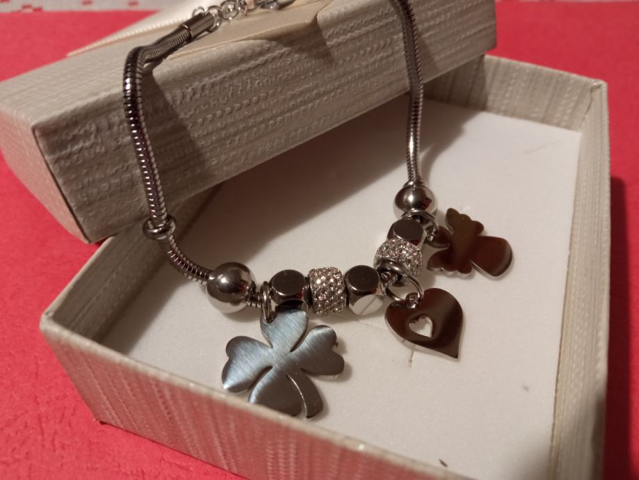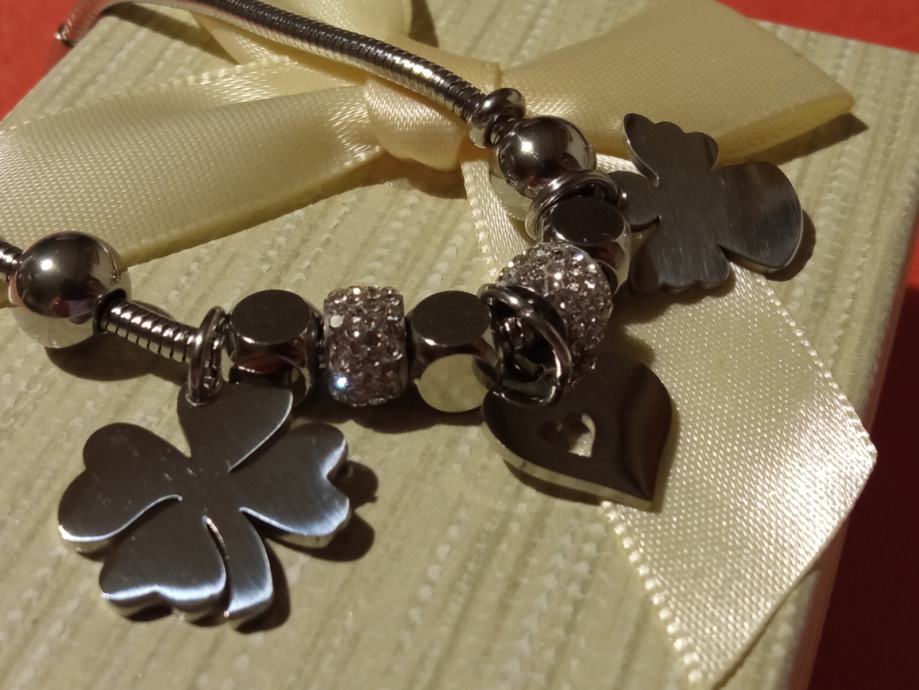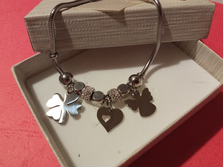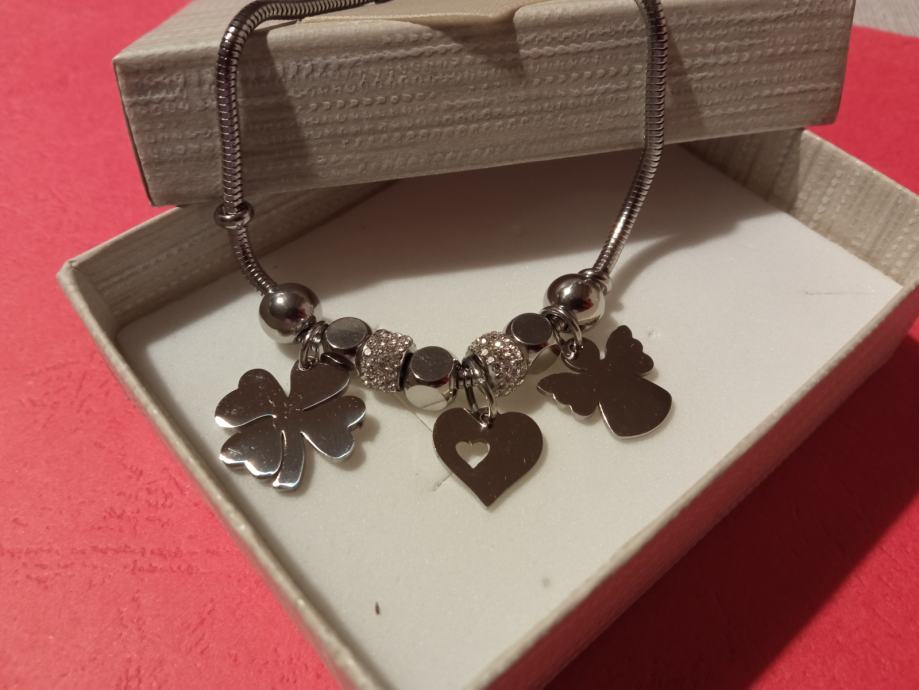 Narukvica je personalizirana što znači da birate privjeske na njoj (slovo, djetelina, srce, zvijezda, djevojčica, drvo života, anđeo, čudotvorna medaljica Majka Božja, križić, anđeosko krilo, sidro, zvijezda, sv.Benedikt, jednorog, slonić, sova, šapa, obitelj, djevojčica i dječak, itd.)